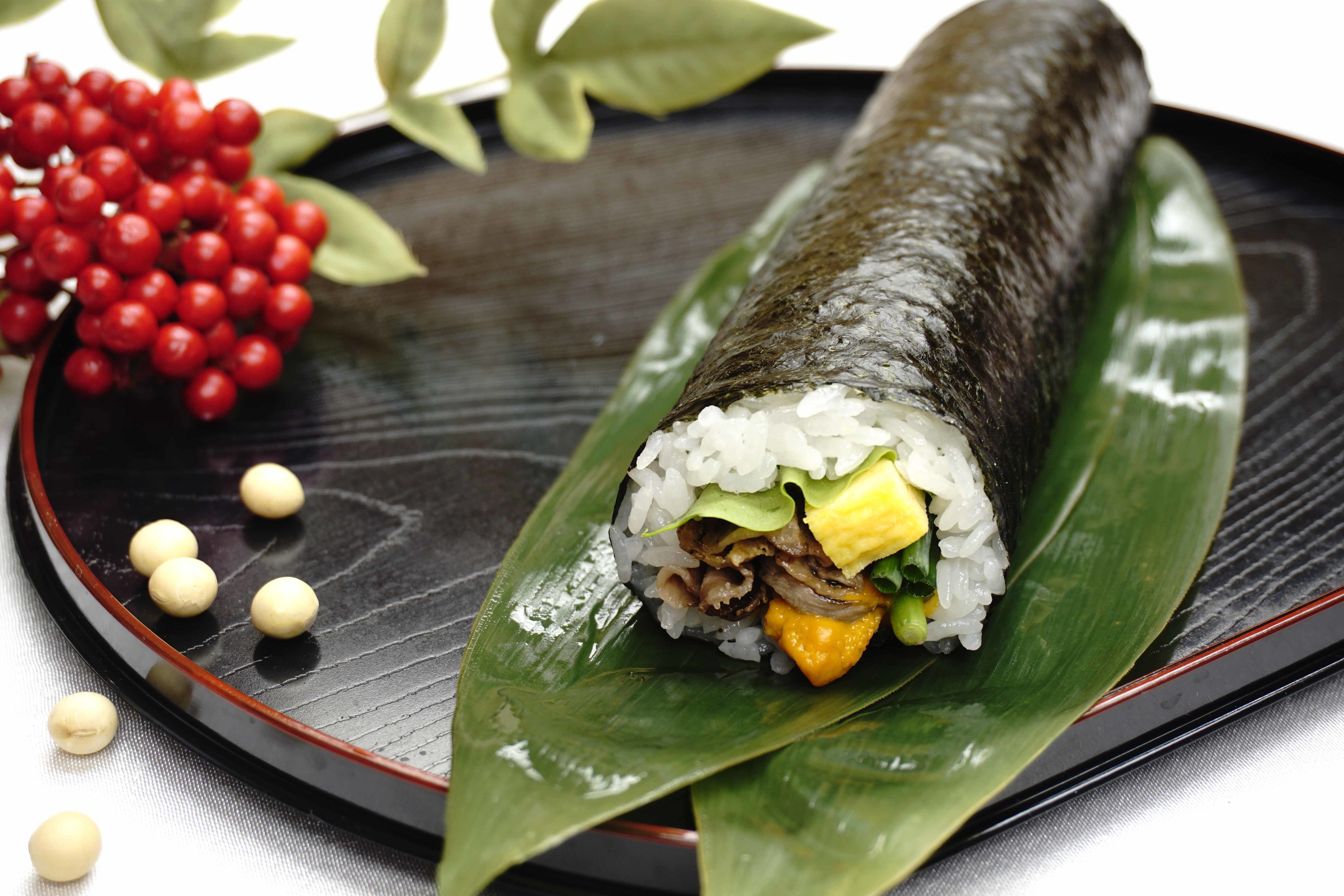 上質できめ細やかな霜降りで肉質がしっとりとしている前沢牛は程よくあぶって余計な脂を落とし、肉の旨みを閉じ込めて香ばしく仕上げ、生うにと合わせて深いコクと旨みを味わえる恵方巻に仕上げました。