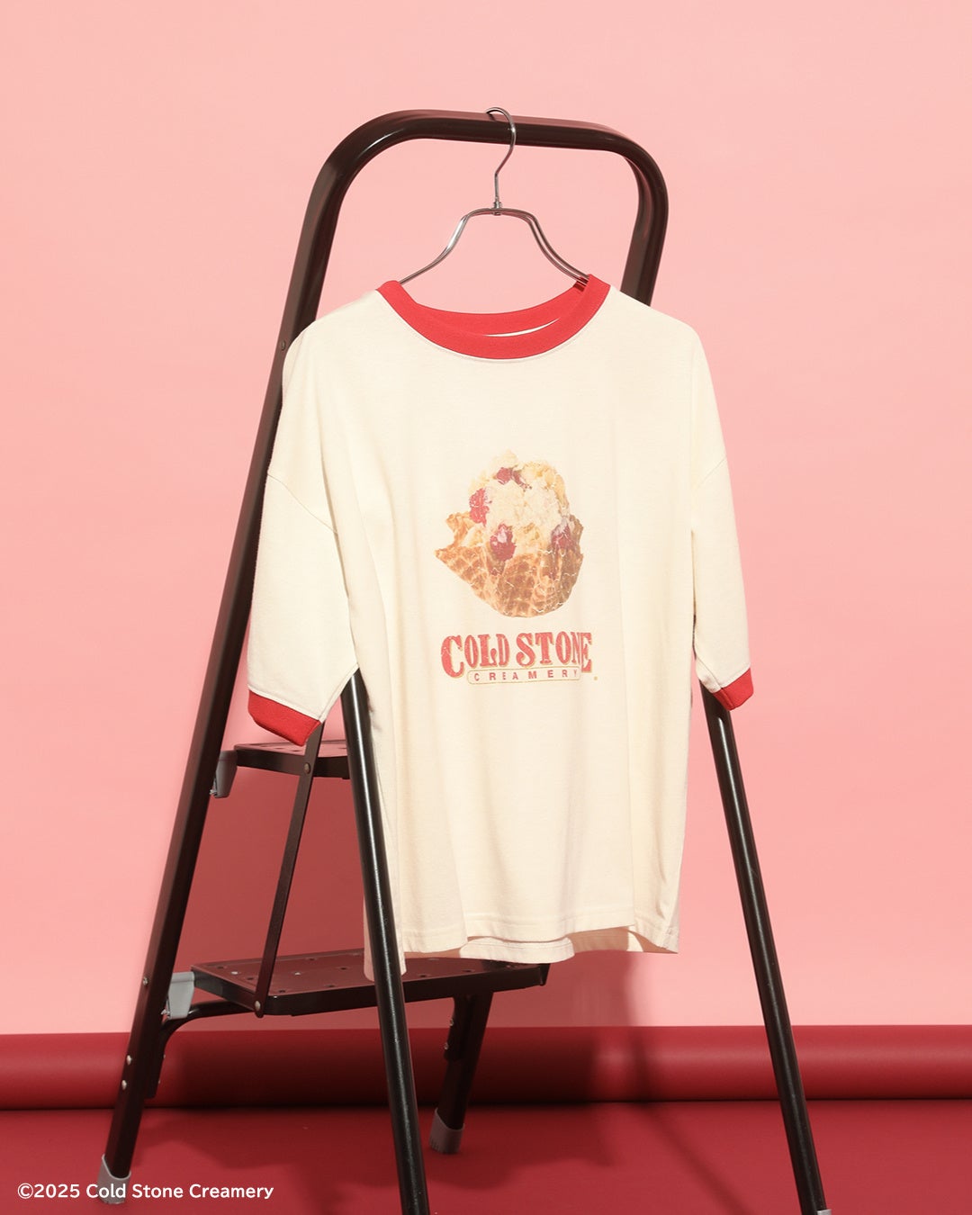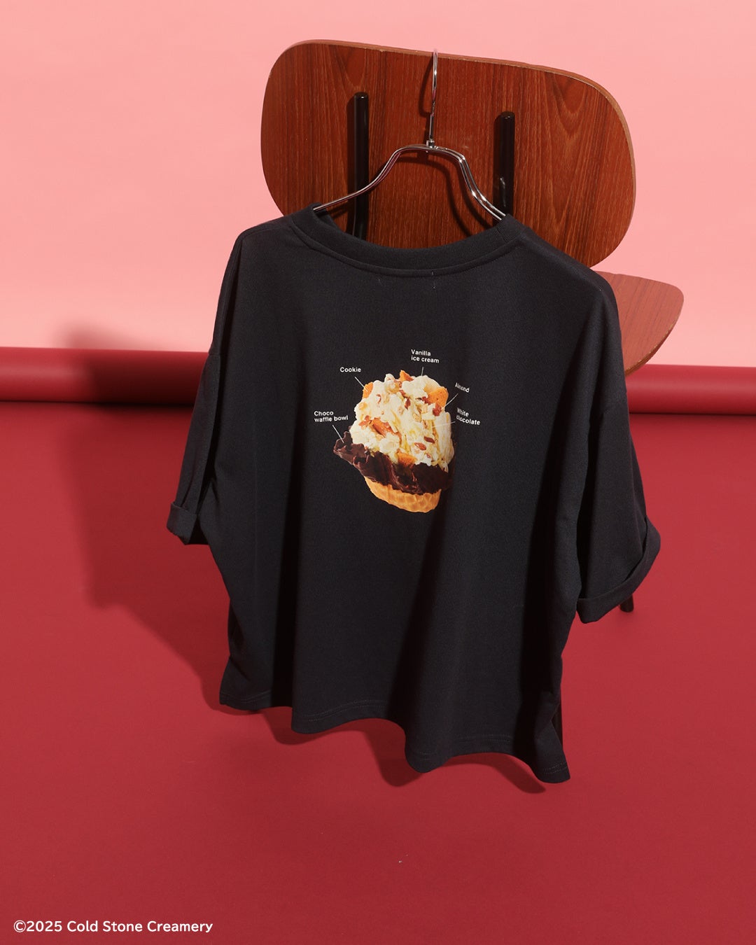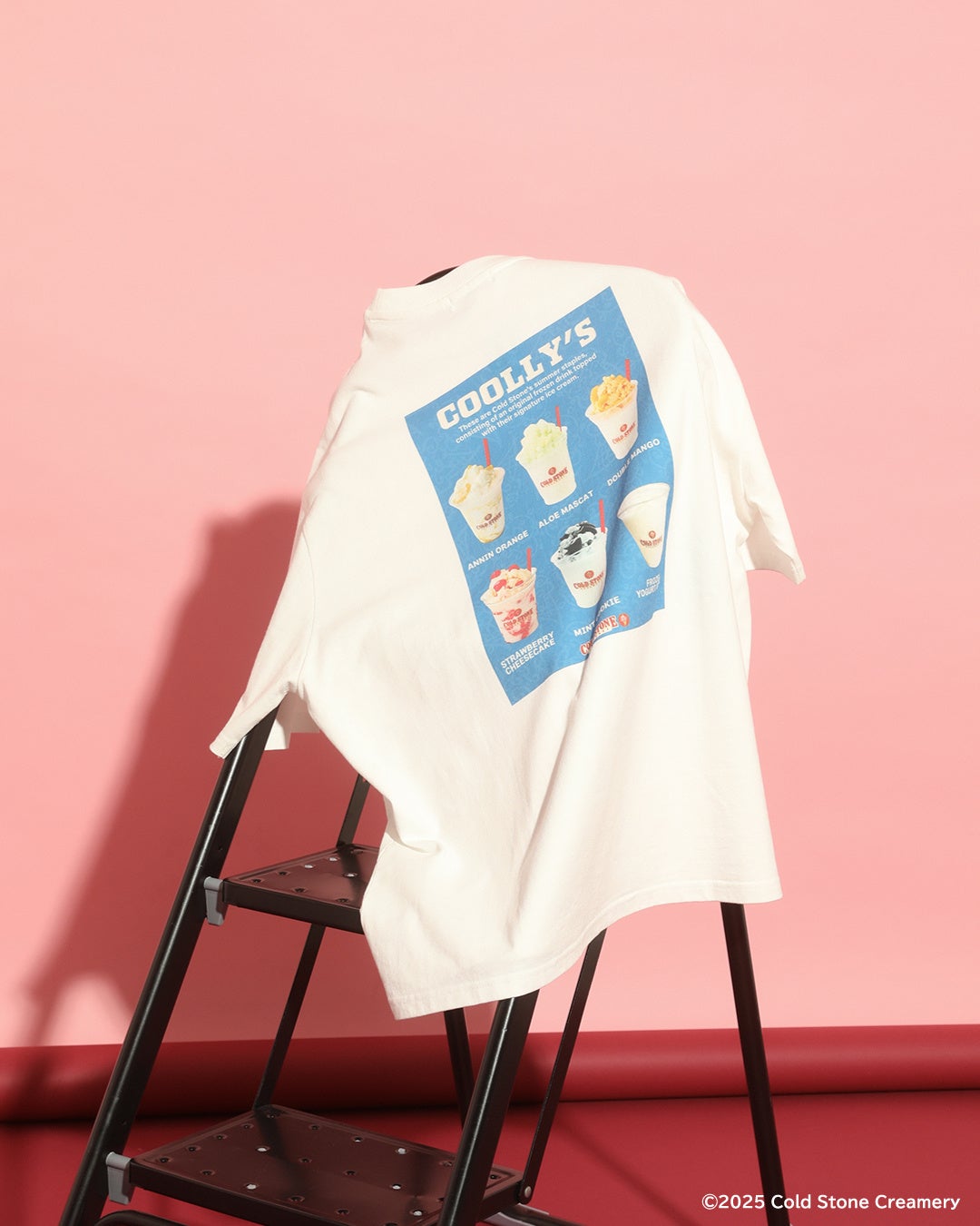 暑い日に活躍するノースリーブのトップスは、フロントに『コールド・ストーン・クリーマリー』のロゴと、バックには多彩なフレーバーのアイスクリームをプリント。一枚で着やすい半袖Tシャツは、ビッグシルエットやクロップド丈、ベーシックの3種類を揃え、それぞれ定番のアイスクリームやフローズンドリンクのアートをデザインし、今にも食べたくなるようなキャッチーなラインアップです。