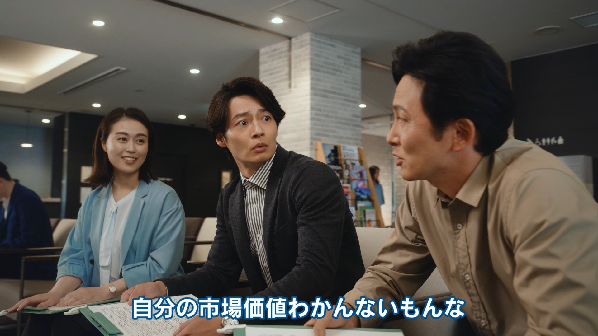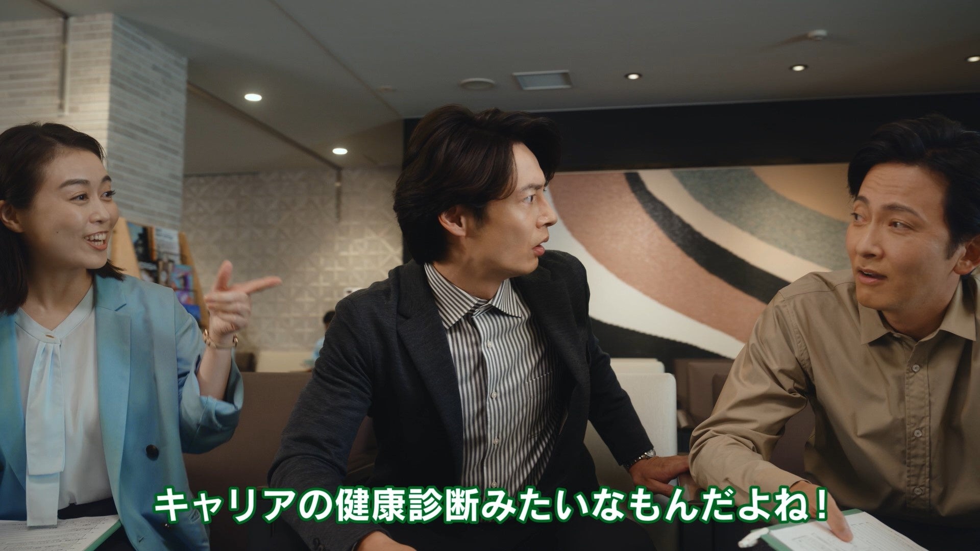 新CMでは、健康診断を受けにきた、田中幸太朗さんが扮するビジネスパーソンが、同僚たちとの会話のなかで、「企業からのスカウトを通じて自身の市場価値を測るためにビズリーチに登録するのが当たり前」ということを初めて知り、驚くというストーリーです。ビジネスパーソンの心の声を、医師に扮した吉谷彩子さんが代弁します。また同僚は、ビズリーチで定期的に自身の市場価値を測ることを「キャリアの健康診断みたいなもんだよね!」と表現します。