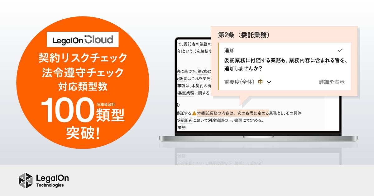 株式会社LegalOn Technologies(本社:東京都渋谷区 代表取締役 執行役員・CEO:角田 望)が提供するAI法務プラットフォーム「LegalOn Cloud」(https://www.legalon-cloud.com/ )の契約審査体制を構築する「契約リスクチェック」「法令遵守チェック」において、契約書に潜むリスクの洗い出しや修正案の提示に対応する類型数が和英合わせて100類型を突破いたしました。