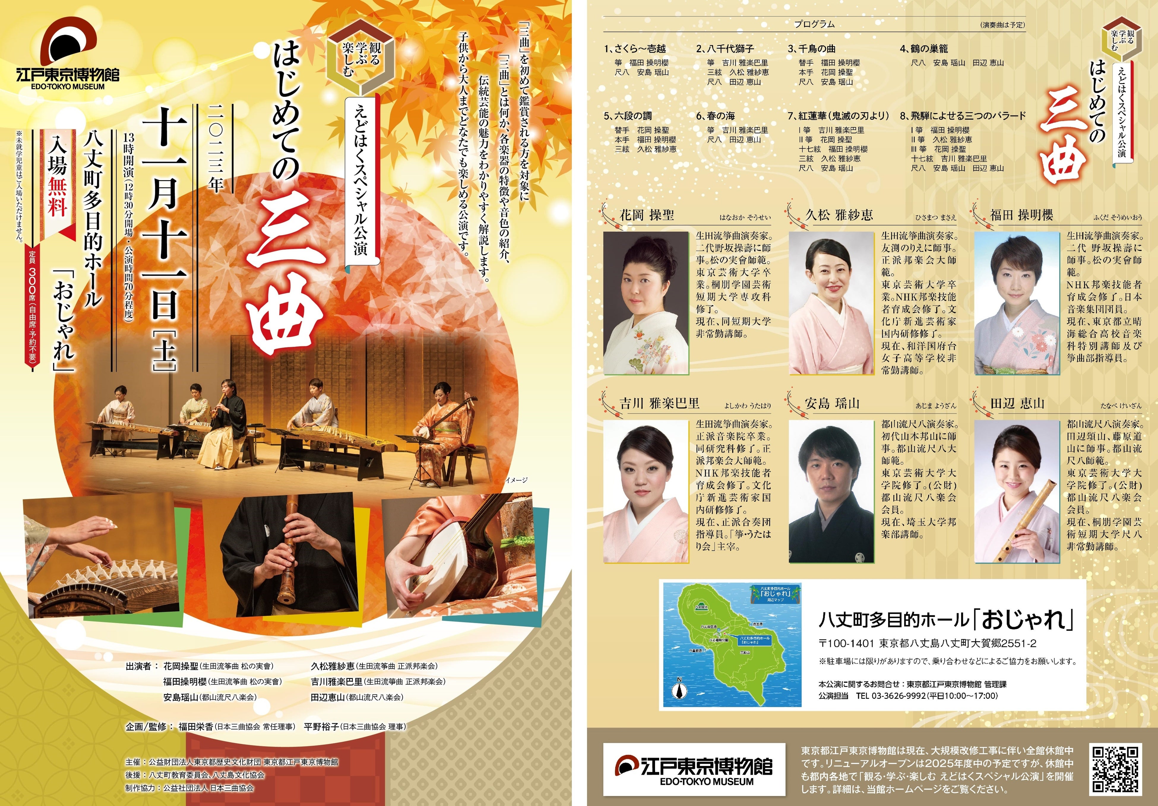 小学生・中学生、また日常邦楽に触れる機会の少ない方々に向けて、箏、三味線、尺八の音色と、日本の音楽の魅力をお伝えします。それぞれの楽器の特徴や演奏の技を解説するとともに、お正月番組や教科書でもおなじみの「春の海」など親しみやすい古典や名曲を中心に演奏します。