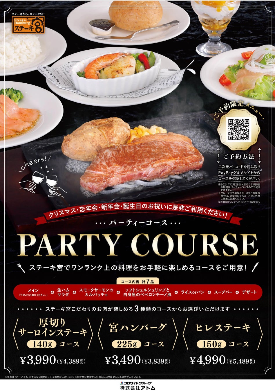 コロワイドグループの株式会社アトム(本社:神奈川県横浜市、代表取締役社長:田中公博)は、「ステーキ宮」112店舗で、12月18日(木)より「パーティーコース」予約受付を開始いたします。