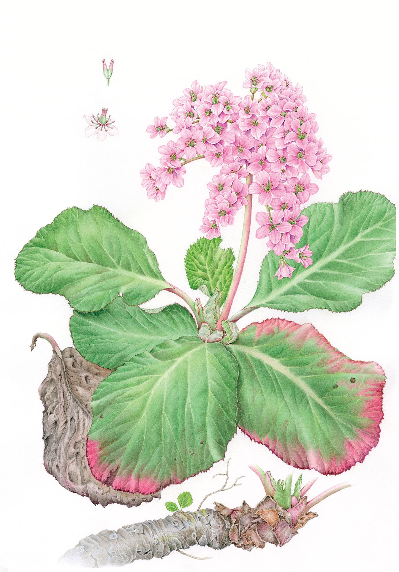 葉が密に茂っている様子が精密に描かれており大変な努力を感じる。一方で、葉と花の色調のコントラストが花を生き生きと見せることに成功している。丁寧に描かれた根の様子など、存在感のある仕上がりになっている。