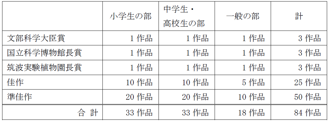 審 査:審査員が、植物学・美術・教育の立場から、観察の注意深さ、表現の正確さ、芸術的な美しさなどを 基準として、令和4年11月16日(水)に国立科学博物館総合研究棟会議室において審査を行った。