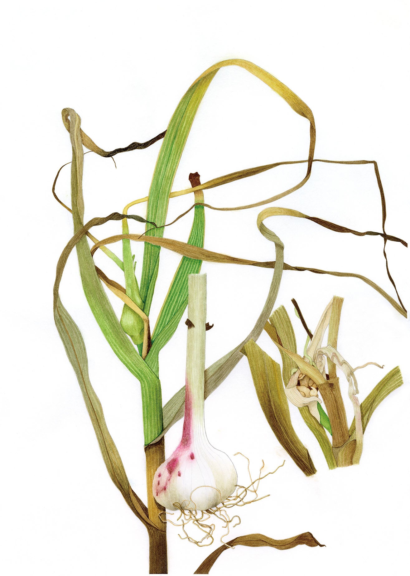 球根が大変よく描かれている。こだわりをもって強調されていることが伝わる。ニンニクなどネギの仲間に特有の薄皮の透明感のある雰囲気など、実物を良く観察している。花部のむかごの特徴もよく捉えている。