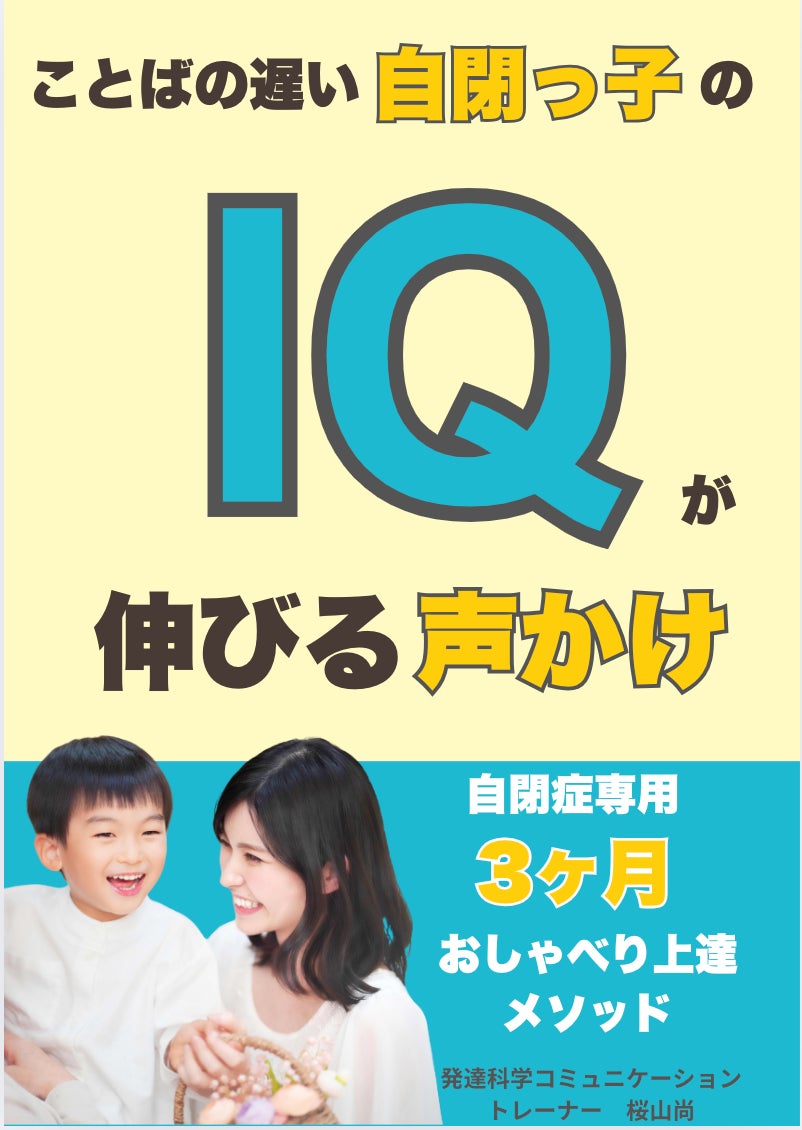 はじめまして 発達科学コミュニケーショントレーナー桜山尚です。ことばの苦手な自閉症児がママとの愛着をもっと深めてことばが伸びるようサポートする専門家として活動しています。この度は、ことばの遅い自閉っ子のIQが伸びる声かけ 自閉症専用3ヶ月 おしゃべり上達メソッド 電子書籍をリリースいたしました。