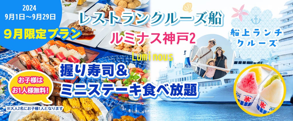 9月の土・日・祝日限定プランお一人様¥8,500-《大人2名で子供1名無料》ルミナス神戸2 (11:30出港) 【握り寿司&ミニステーキ食べ放題 船上ランチクルーズ】