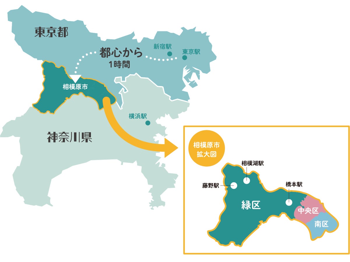 相模原市緑区は、都心から約1時間ほどの、面積が253.9k㎡と本市の中で最も広い区で、区東部においてはリニア中央新幹線の駅の建設や、工業・商業・業務機能などが集積する一方、区西側は美しいやまなみや湖・川など豊かな自然が広がるなど、都市部とみどり豊かな山間部がベストミックスした日本でも珍しいまちです。