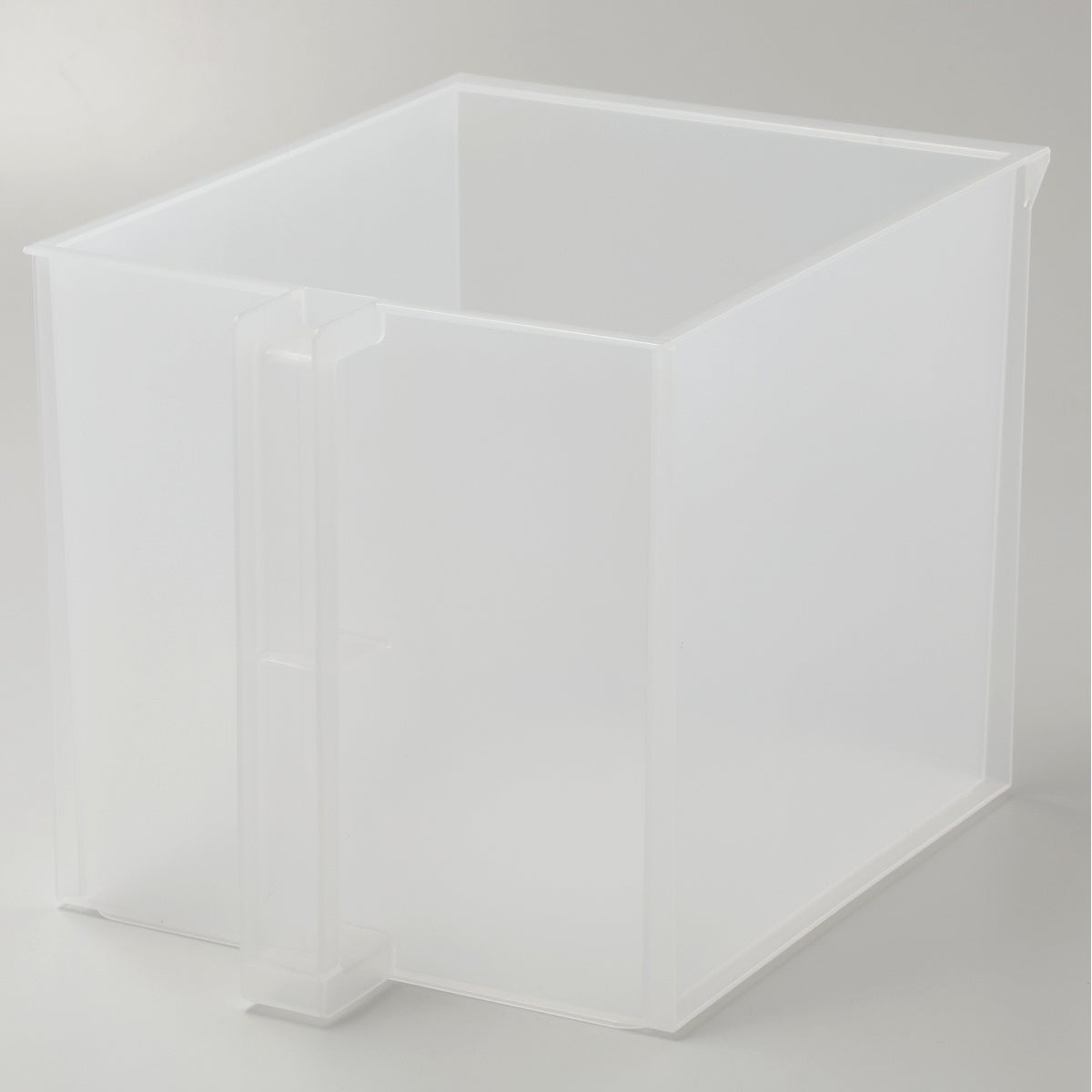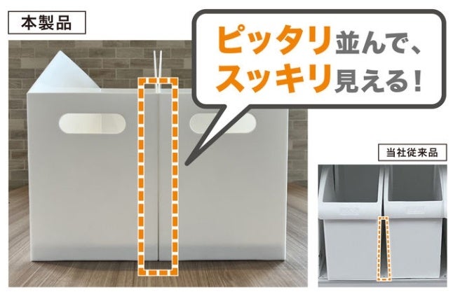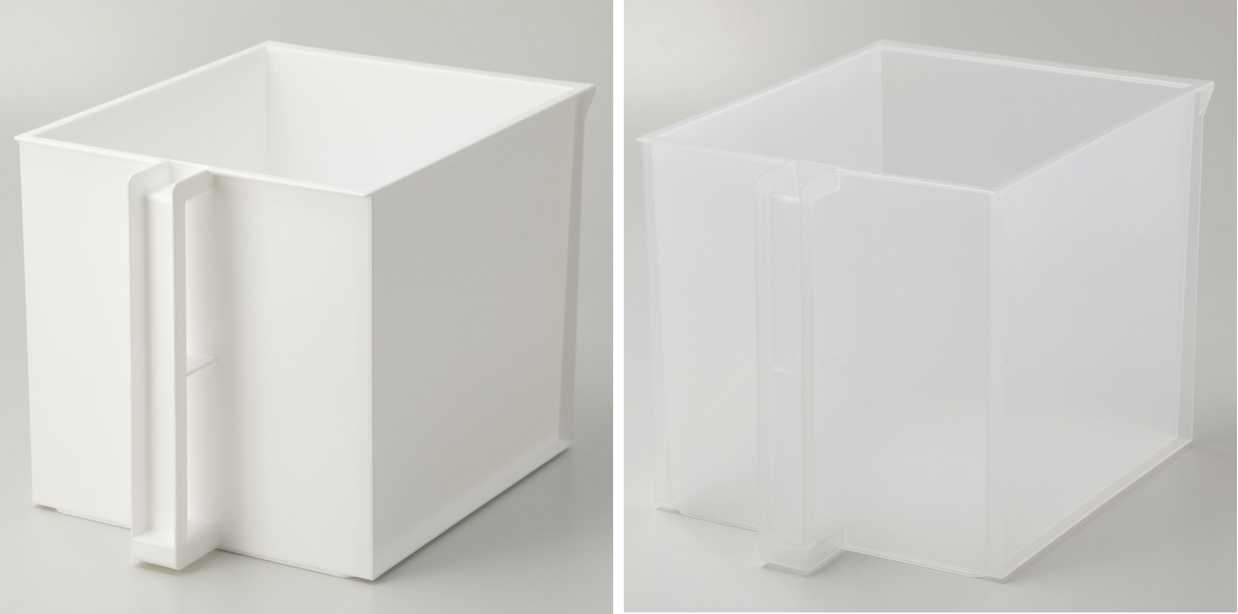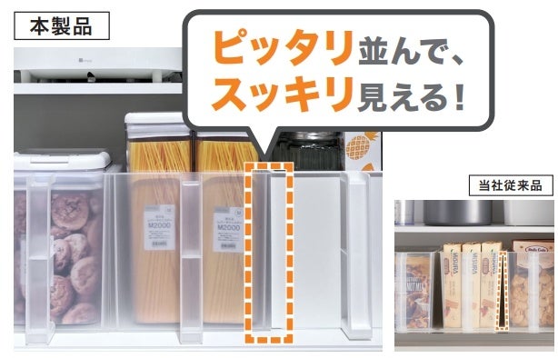 吊戸棚ストッカーは「取っ手が上下に2分割され、高い位置でも持ちやすく、取り出しやすい」「クリア色は中身が見えて便利、ホワイト色は中身を隠せて使い分けできる」とご好評のアイテム。ふちをなくすことで、すき間なくきれいに並べられるため、隣のストッカーと干渉せず、よりスムーズに出し入れができるようになりました。また、見た目もスッキリです。