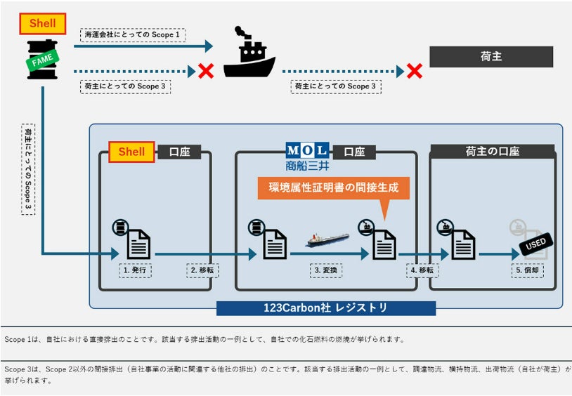 株式会社商船三井(社長:田村 城太郎、本社:東京都港区、以下「当社」)は、Shell Trading Rotterdam B.V.(以下「Shell」)と連携し、第三者が運航する船舶で低炭素燃料が使用されたことにより生まれた温室効果ガス(GHG)削減効果を、当社が証明書(環境属性証明書:註1)として、当社のお客様に提供できる仕組み(間接生成:註2)を実証しました。