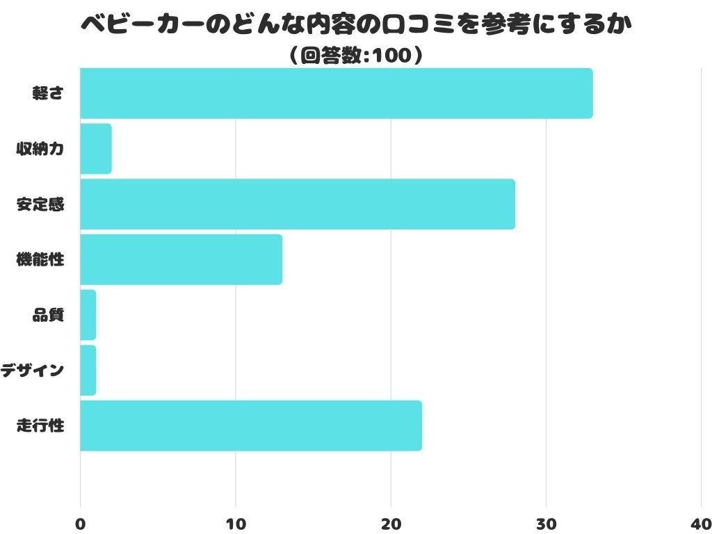 ベビーカーのどんな内容の口コミを参考にするかをアンケートにて調査したところ、1位は「軽さ」でした。