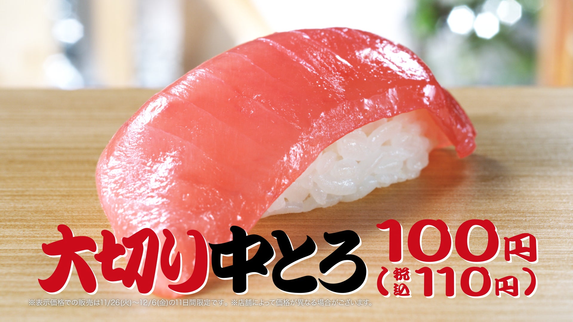 通常価格150円(税込165円)の「大切り中とろ」を期間限定で100円(税込110円)で販売します。「大切り中とろ」のとろけるような味わいをお楽しみください。