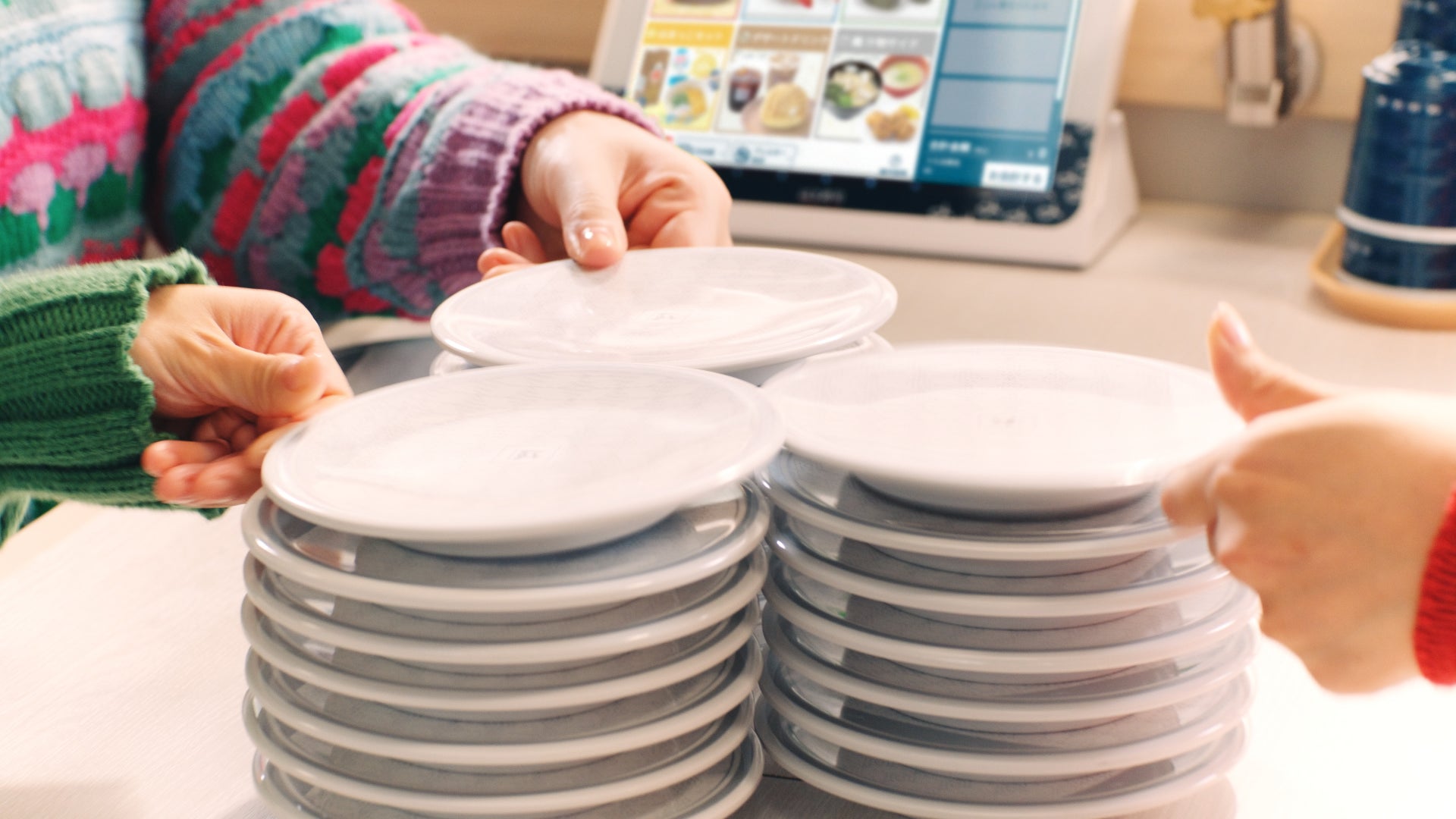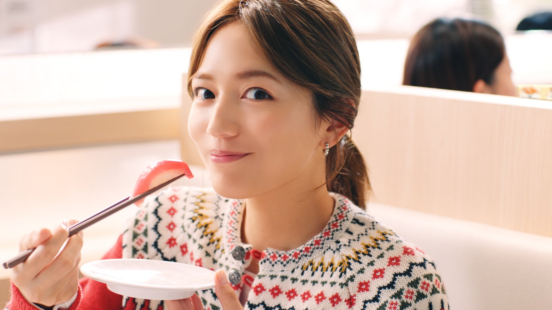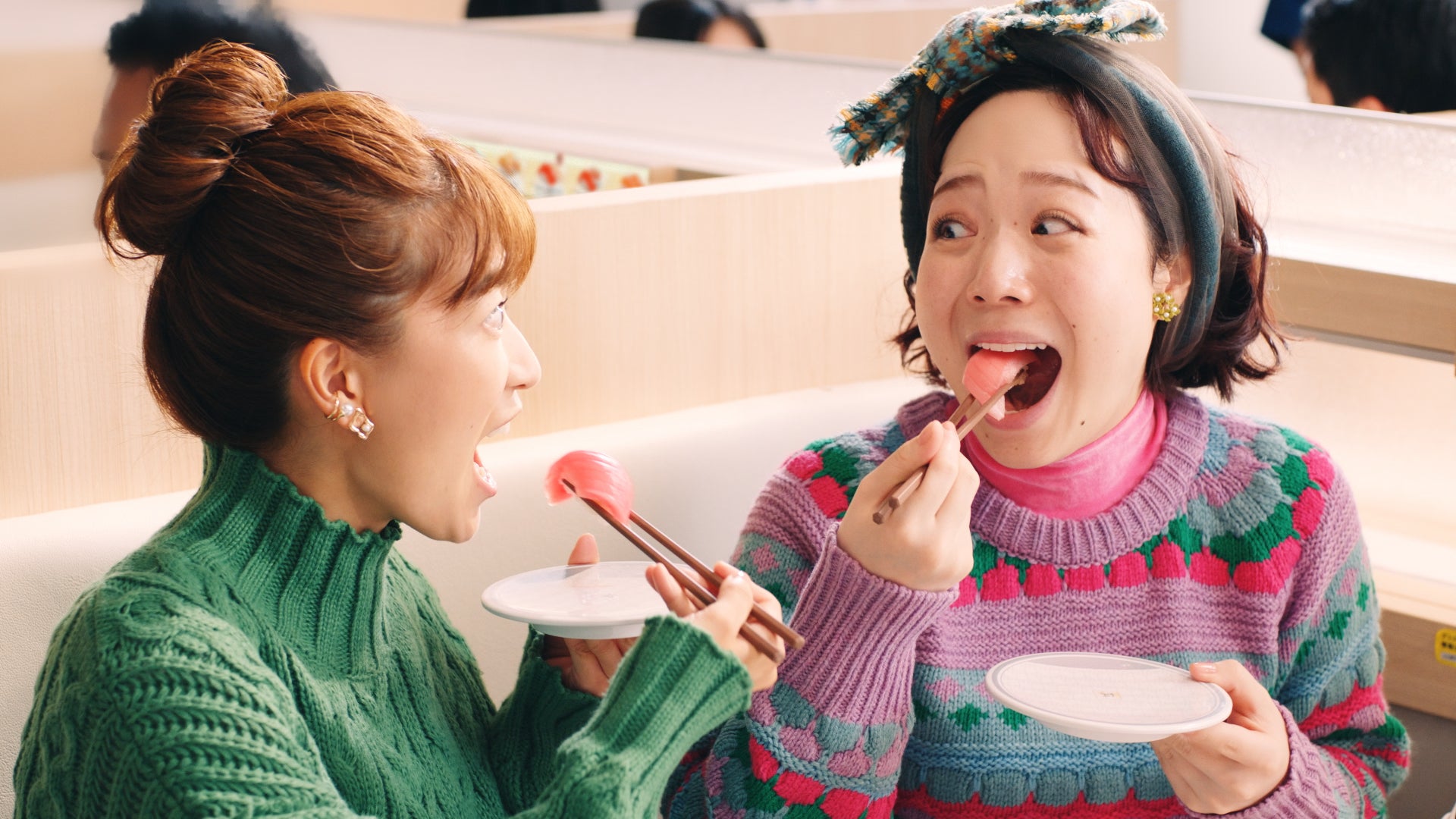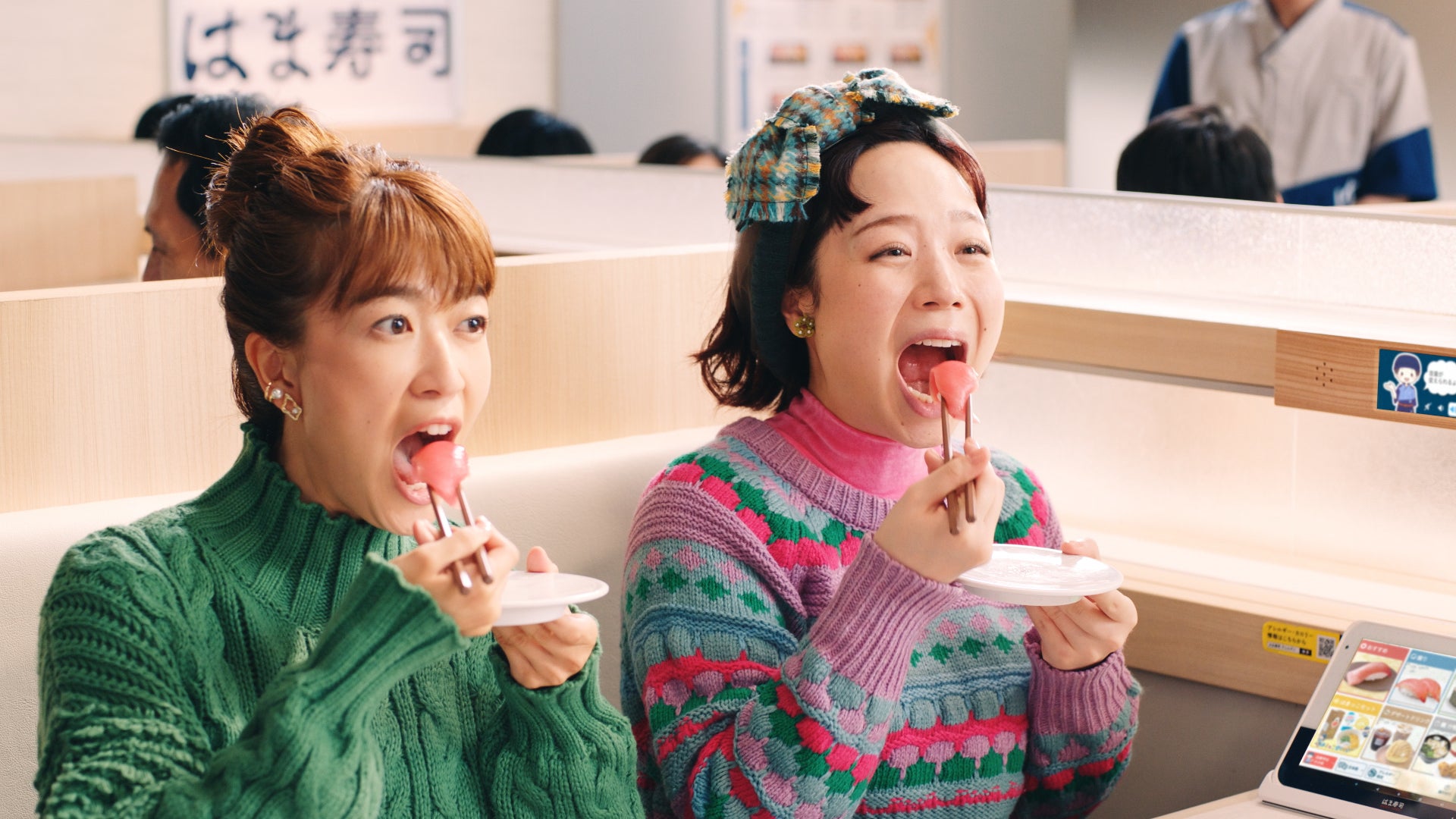 CMは、川口さんが「大切り中とろが100円…!?」と驚く様子からスタートします。「大切り中とろ」のあまりのおいしさとお手頃さに、どんどんお皿を重ねてしまう川口さんと友人。「誰か私を止めて~!」と心の中で叫びながらも、中とろのとろけるような至福の味わいを「ん~♡」と堪能する川口さんの表情にご注目ください。