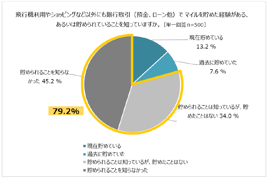 調査結果からもわかるようにマイルの獲得方法というと、カード決済や飛行機搭乗のイメージが持たれていますが、実は預金やローンなど銀行取引においてもマイルを貯めることが可能です。しかし、実際に貯めている人は少なく、銀行取引でマイルを貯めたことがない人は調査対象者全体の約80%に及びます。