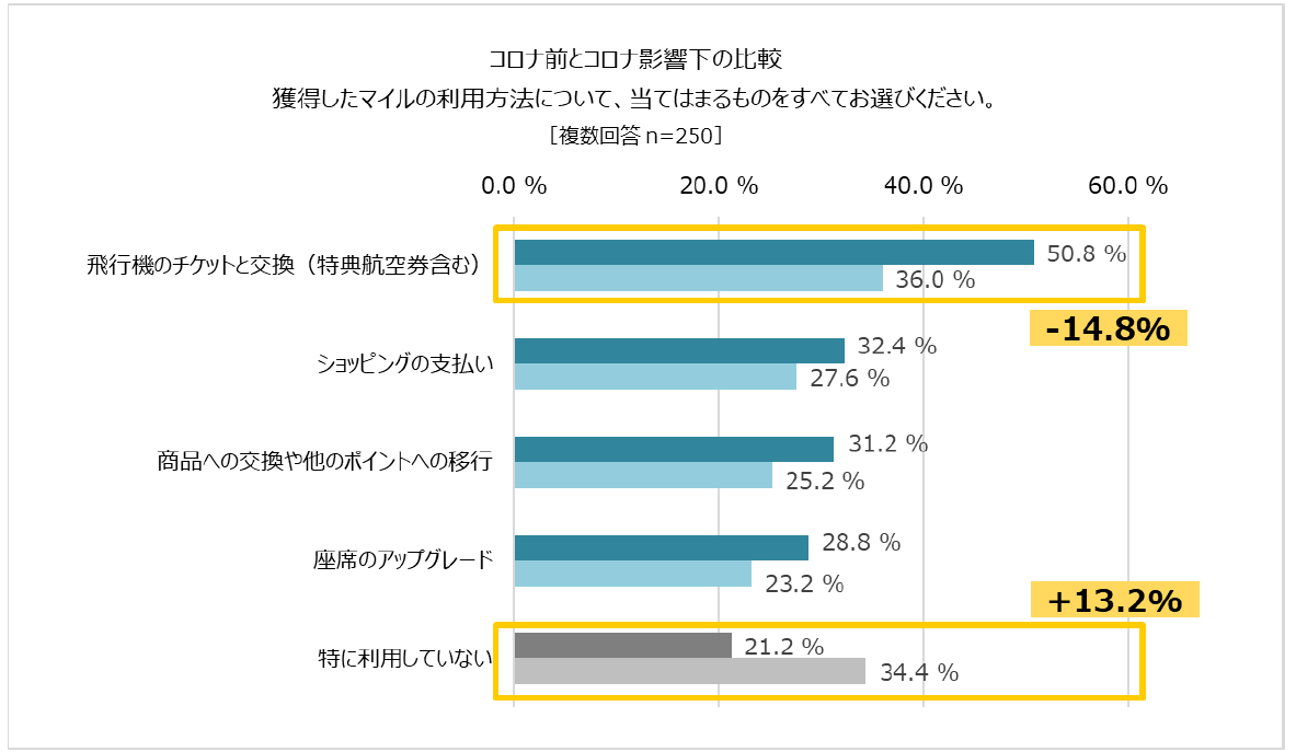 そこで、獲得したマイルの利用方法についても聞いたところ、コロナ前とコロナ影響下で一番変化があったのは「飛行機のチケットと交換(特典航空券を含む)」でした。コロナ前は50.8%だったのに対し、コロナ影響下では36.0%となり14.8%減少しました。これは、コロナ影響下で旅行を控える人が増えたことが大きな要因であると考えられます。また、「特に利用していない」という人も増加しており、コロナ前は21.2%だったの対し、コロナ影響下では34.4%という結果になりました。