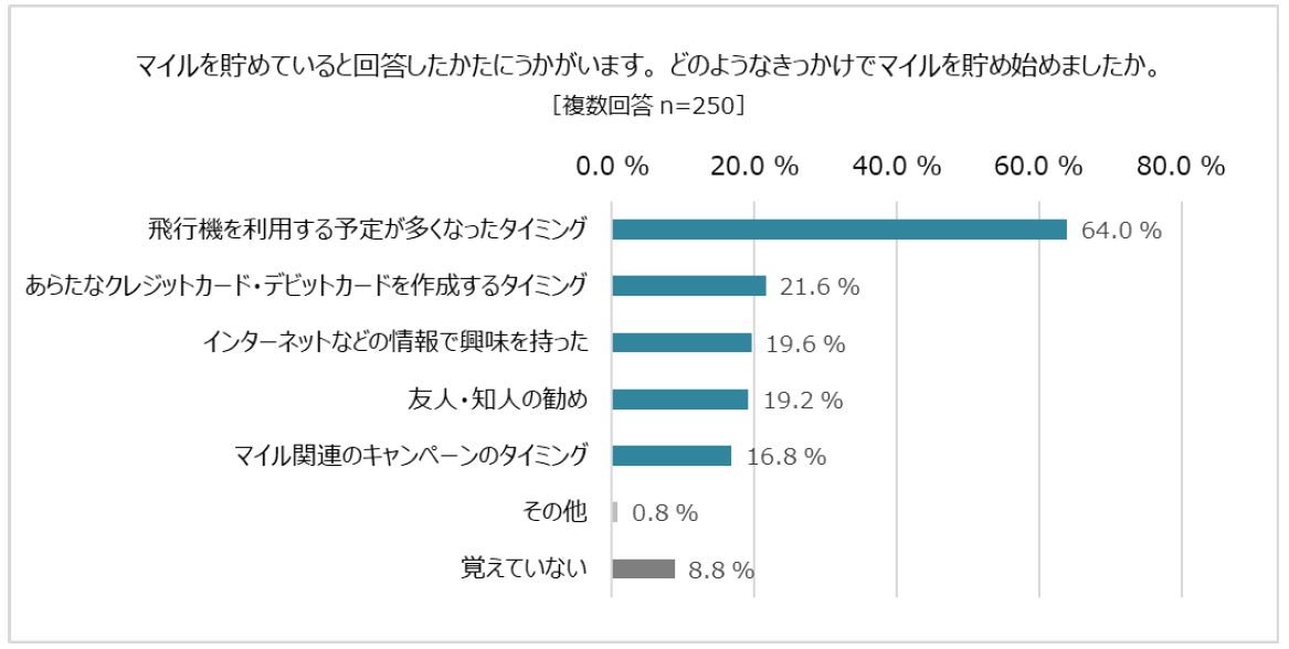 マイルを貯めている人に、マイルを貯め始めたきっかけを聞いたところ、第1位「飛行機を利用する予定が多くなったタイミング(64.0%)」、第2位「あらたなクレジットカード・デビットカードを作成するタイミング(21.6%)」、第3位「友人・知人の勧め(19.6%)」という結果になりました。また、最も多くマイルを獲得した方法は、第1位「カード決済(50.8%)」、第2位「飛行機の搭乗(38.0%)」、3位「他のポイントからの交換(5.2%)」でした。