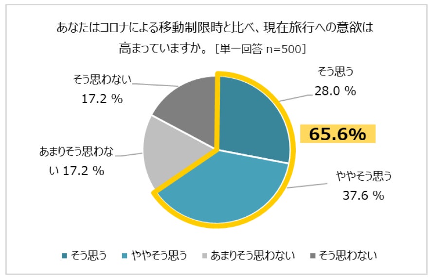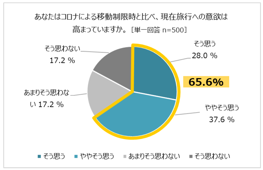 ・65%の人が、コロナによる移動制限時と比較して旅行への意欲が高まっている。