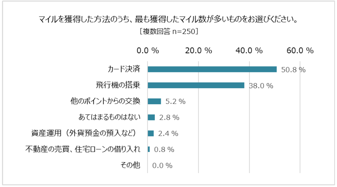 ・最も多くマイルを獲得した方法は、第1位「カード決済(50.8%)」、第2位「飛行機の搭乗(38.0%)」。