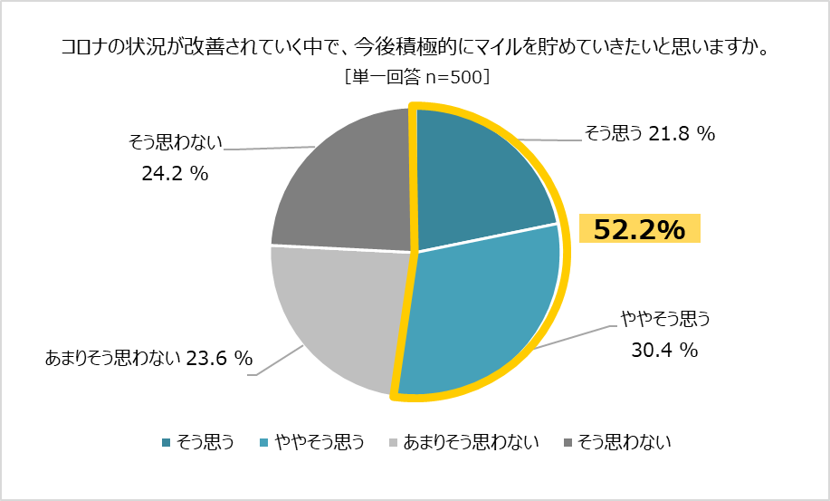 ・コロナの状況が改善されつつあることに期待して、 半数以上の人が「今後積極的にマイルを貯めていきたい」と考えている。