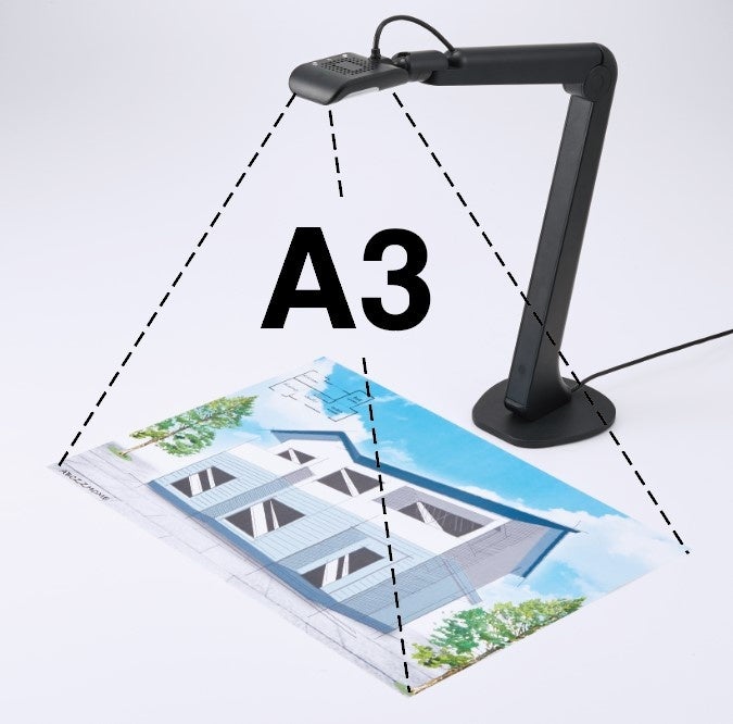 カメラは800万画素で、人の顔や手元もきれいに映すことができます。さらにオートフォーカス機能付きなので、ヘッドのボタンでフォーカスを自動で調節し、対象物を鮮明に映し出します。最大A3サイズ相当の広範囲を撮影可能です。