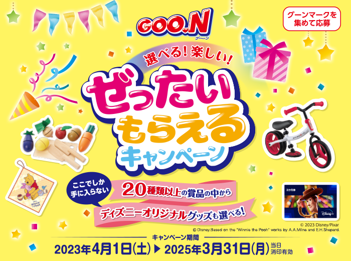 また、対象のグーン商品をご購入いただき、「グーンマーク」を集めると、ここでしか手に入らないディズニーオリジナルグッズなど20種類以上の賞品から選べる「ぜったいもらえるキャンペーン」も実施中です。