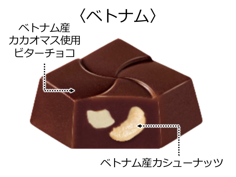 強い酸味が特徴のベトナム産カカオマスと、世界的な生産量を誇るベトナム産カシューナッツの組み合わせ。