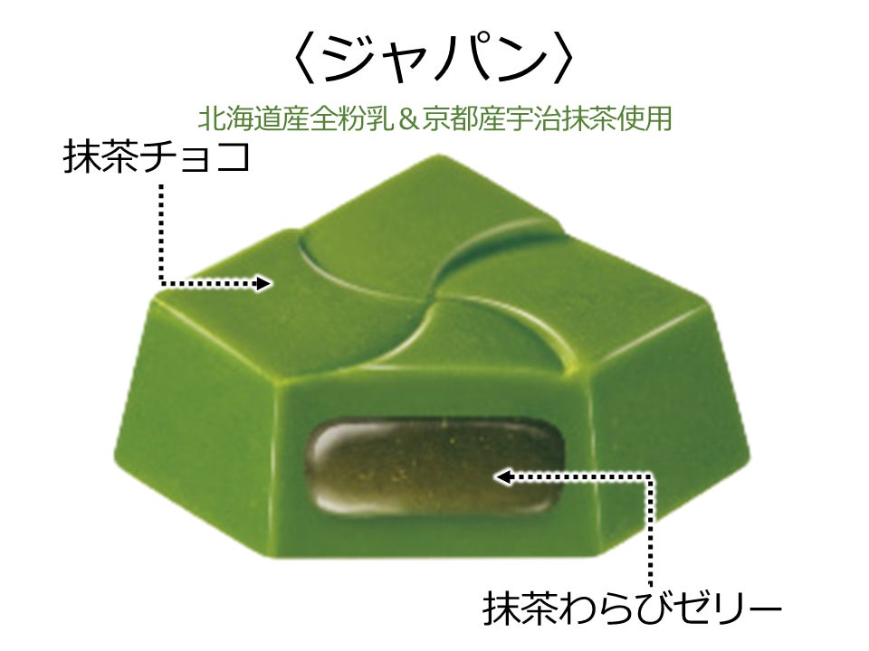 北海道産全粉乳を使ったホワイトチョコを京都産の宇治抹茶で仕上げた抹茶チョコと、わらびゼリーが相性抜群。