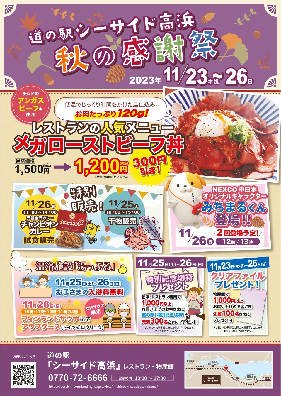 中日本エクシス株式会社 福井・近江支店(福井市、支店長・鈴木(すずき)智之(ともゆき))は、福井県大飯郡高浜町より指定管理を受け運営している「道の駅シーサイド高浜」において、日頃の感謝の意をこめて「秋の感謝祭」を、2023年11月23日(木・祝)から11月26日(日)まで開催します。