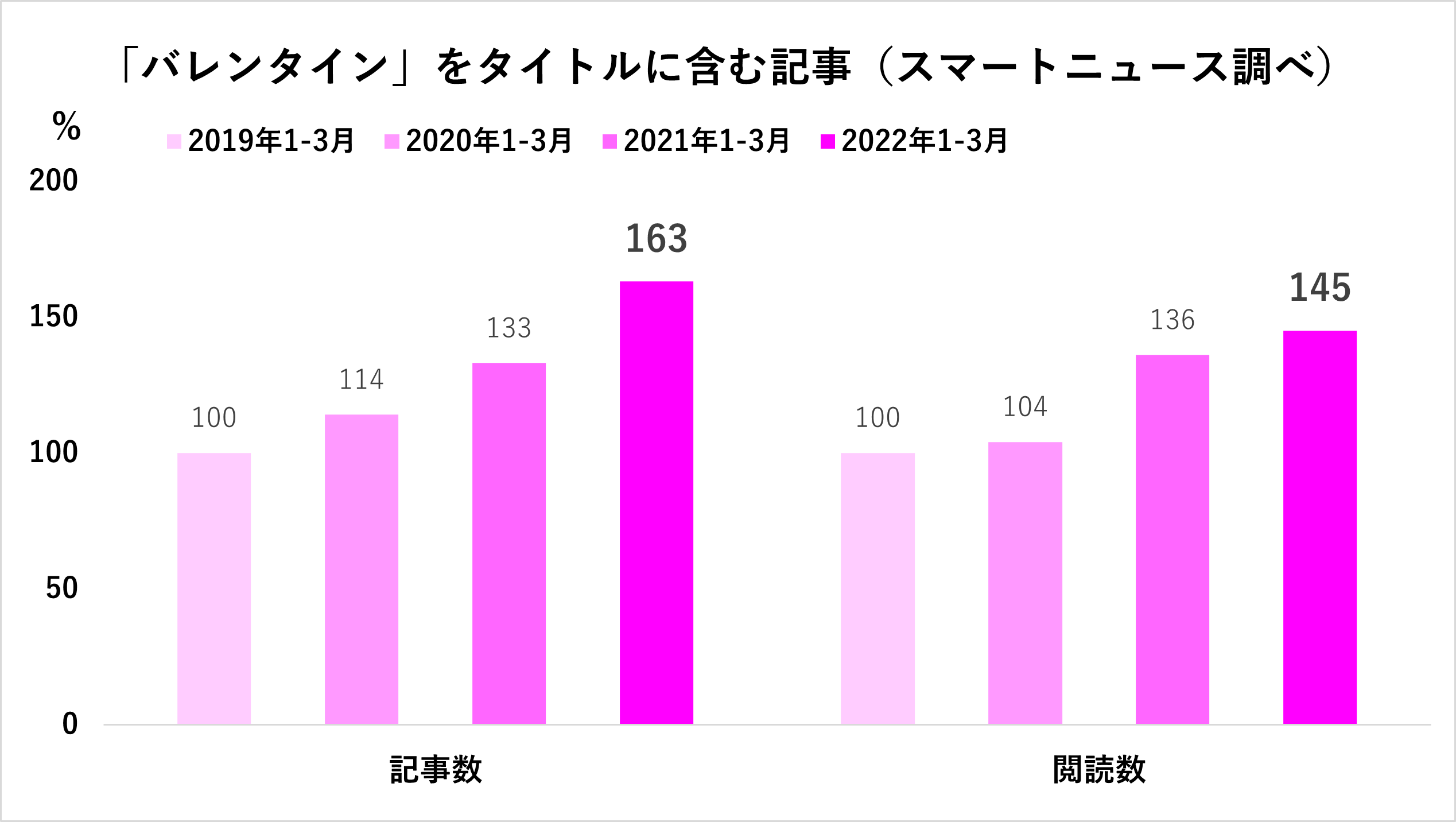 2019年から2022年の同時期(1月~3月)に掲載された、タイトルに「バレンタイン」を含む記事は、記事数、閲読数ともに3年連続で増加しました。2019年との比較では、記事数は約1.6倍、閲読数は約1.4倍となり、コロナ禍においてもバレンタインへの関心は増え続けていたことがうかがえます。