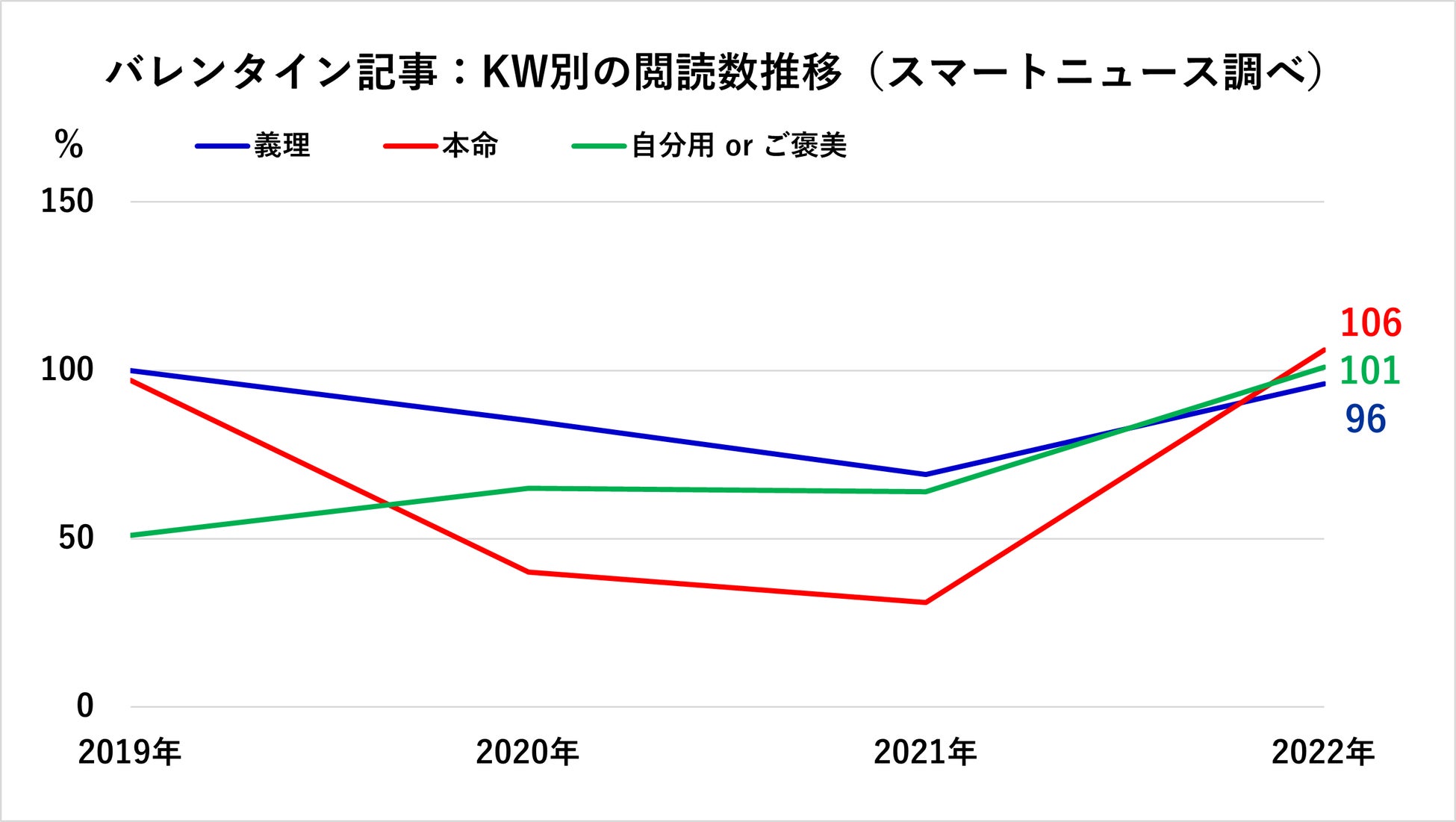 「バレンタイン」記事の中で、関心が高まり続けていることが読み取れたのは、タイトルに「自分用(またはご褒美)」を含む記事です。2019年からの3年間で、閲読数は約2倍に増加しています。「本命」「義理」をタイトルに含む記事との比較では、2022年の閲読数が「本命」に次いで多いものとなり、「義理」を上回りました。