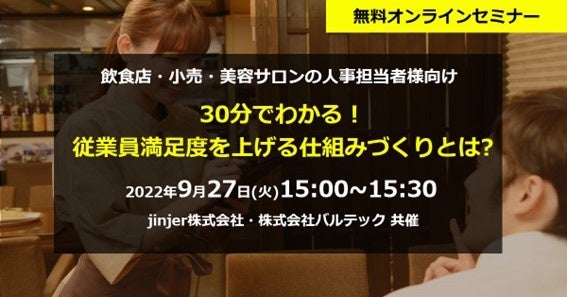 株式会社バルテック(本社:東京都新宿区。以下、バルテック)とjinjer株式会社(本社:東京都新宿区)は、9月27日(火)15:00より「アルバイト・スタッフが定着しない」悩みを抱える店舗マネージャー、人事担当者様を対象に『30分でわかる!従業員満足度を上げる仕組みづくりとは』WEBセミナーを開催いたします。