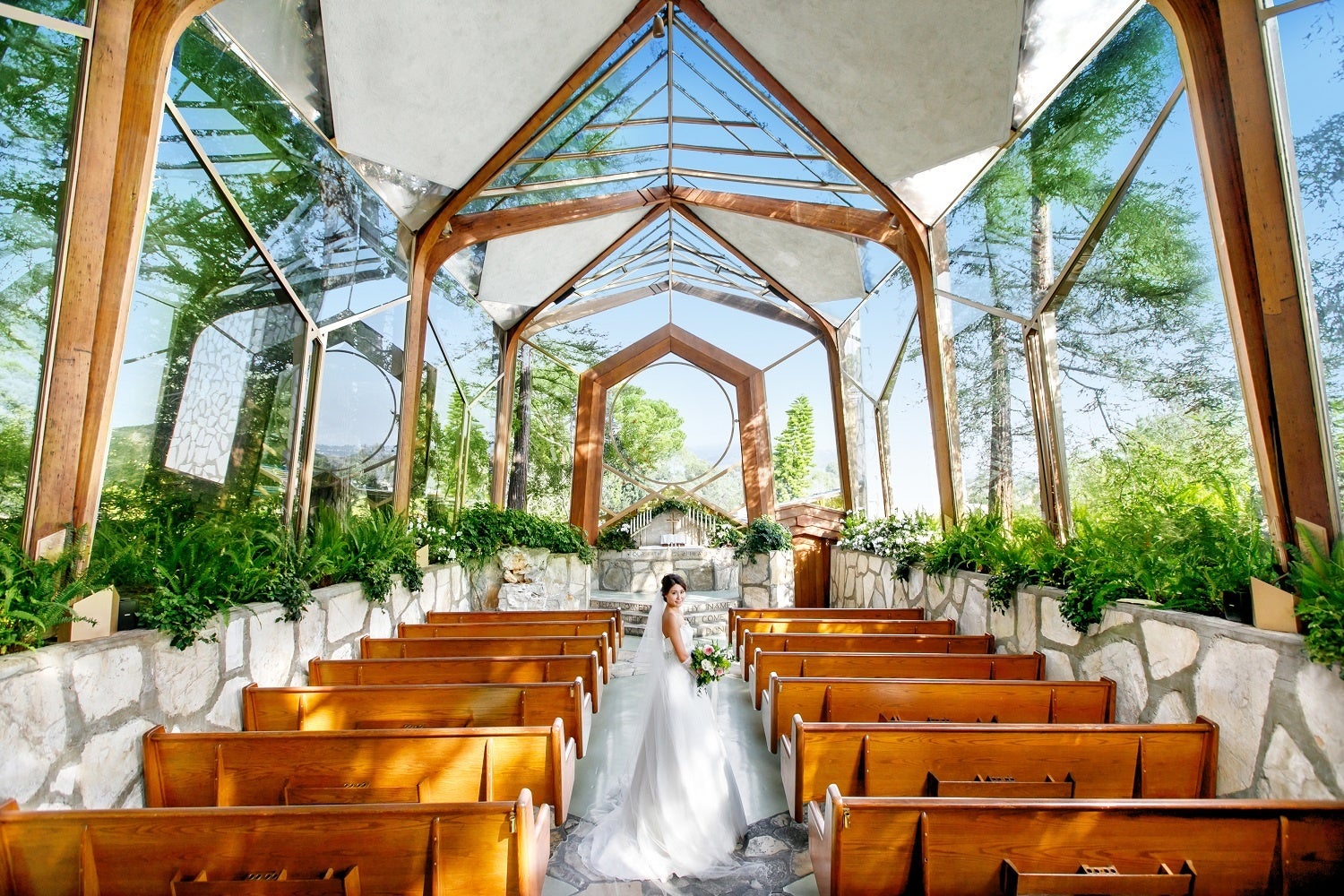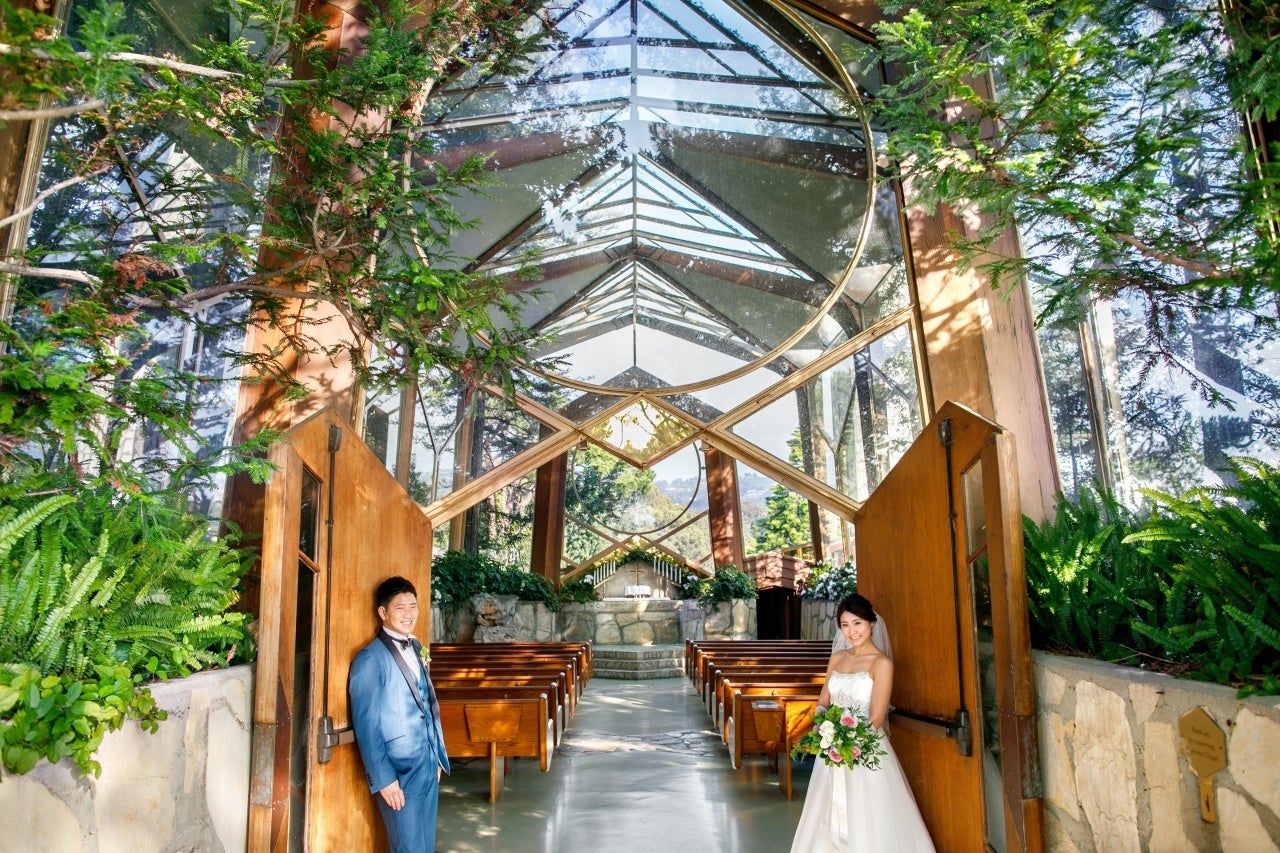「ウェイフェア・チャペル」は、ダウンタウンより車で約1時間、レドンド・ビーチに程近い海岸線沿いに佇み、1949年創立のフランク・ロイド・ライトの子息がデザインを手がけたことでも有名なガラスの教会です。壁面は360度ガラス張りで構成され、周囲に生い茂る樹木や青い空、どこまでも広がる海が一望出来ます。教会の隣に建つ石塔には16個の鐘があり、何層にも重なった重厚で美しい音色がおふたりの挙式を祝福してくれます。全米の挙式会場の中でも根強い人気を誇り、全米の花嫁様が憧れる挙式会場です。ハリウッドセレブに留まらず日本の著名人からも圧倒的な支持を受けています。