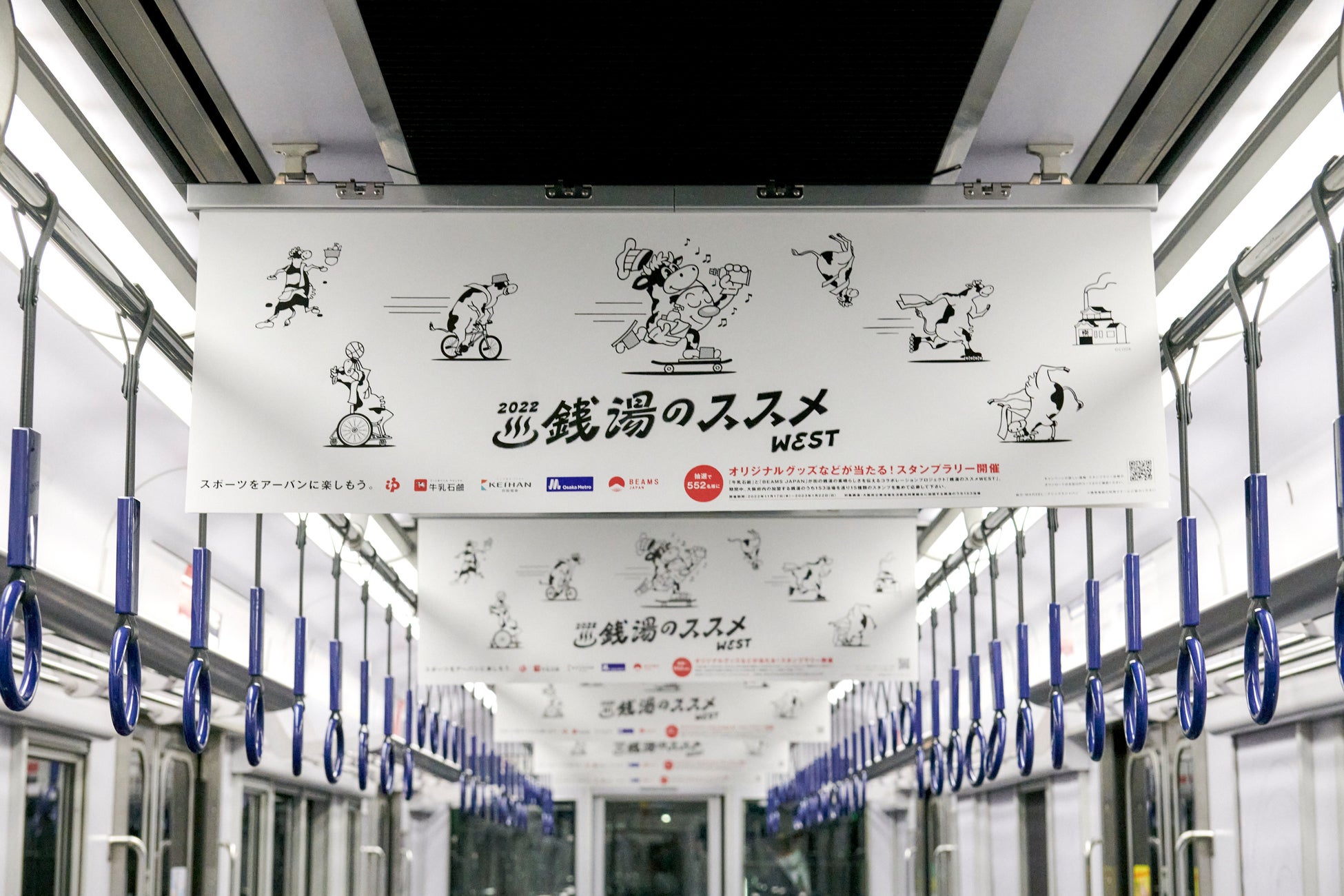 プロジェクトの開催を記念して、京阪電車では「銭湯のススメWEST列車」の運行がスタートしました。COOK氏が手掛けた本プロジェクトのアートワークと、アーバンスポーツを楽しむ人たちの写真で京阪電車1編成の車内を丸ごとジャックし、オリジナルヘッドマークも掲出しています。