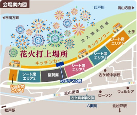 松戸花火大会は、打ち上げ場所が近く、伝統的な花火を間近で見られるのが最大の特徴です。会場内ではフードやドリンクを楽しめるキッチンカーが出店し、花火大会を盛り上げます。キッチンカーは、有料席・協賛席のチケットをお持ちの方のみ利用可能です。また、今年はより花火に近いエリアに臨場感あふれる写真が撮影できるカメラマン席もご用意しています。有料席(シート席・カメラマン席)は、6月16日(月)10時より販売を開始します。
