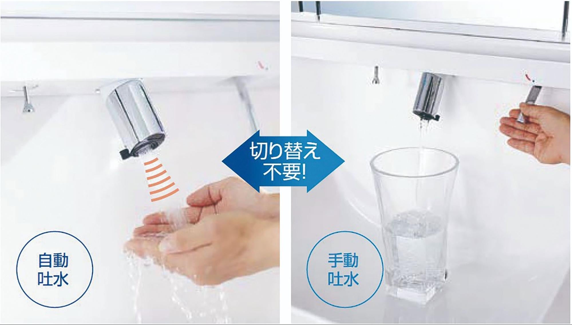 自動吐水と手動吐水の切り替え操作が不要で、目的に合わせて使いやすい水栓です。自動吐水では、”手をふれずに差し出すだけのワンアクション”で水が出てくるのでハンドルを汚さずに手を洗うことが可能です。また、花瓶の水汲みなどの連続で手動吐水をしたいときには、”ハンドルを操作するだけのワンアクション”で操作ができます。手動吐水は停電時でも使えるので安心です。