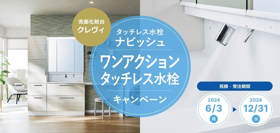 今回実施するキャンペーンは、対象期間中に「クレヴィ」をご成約いただくと、水栓金具を無償で「タッチレス水栓 ナビッシュ」にアップグレードでき、より快適に洗面空間をお使いいただける内容となっております。