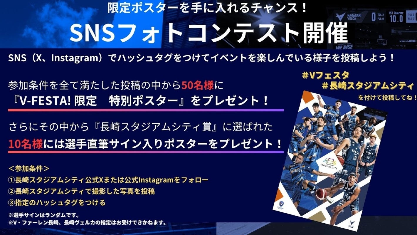 期間中、SNS(X、Instagram)でハッシュタグをつけてイベントを楽しんでいる様子を投稿していただくと、参加条件を全て満たした投稿の中から50名様にV・ファーレン長崎と長崎ヴェルカがコラボレーションした「V-FESTA!限定 特別ポスター」をプレゼントいたします。