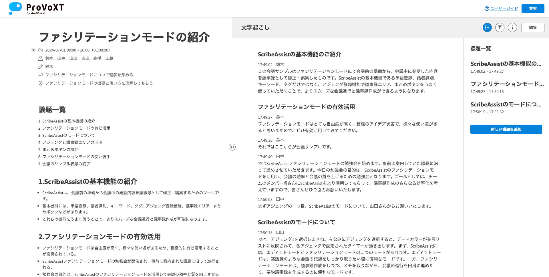 さらに、「ScribeAssist」のみを契約した場合でも、「ProVoXT」の新機能である「議事録エディタ」を活用し要約機能を利用することが可能です。これにより、ユーザーの希望の形式で議事録のフォーマットを設定し、作成した議事録をURLで関係者へスムーズに共有できます。