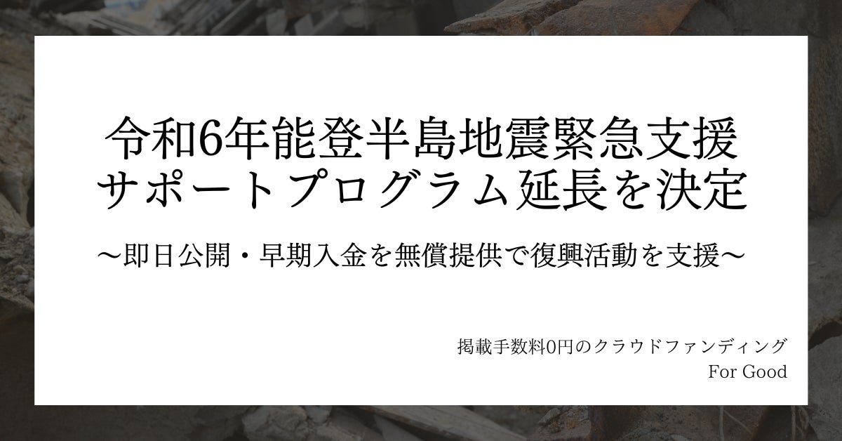 For Goodは能登半島の被害の大きさを鑑みて、能登半島地震の復旧・復興や事業の継続のための支援を募る際には、サービス手数料を0円、有償の一緒プランのサポートを一部無料で提供することで、クラウドファンディングを通じて被災地の復興を支援してまいりました。