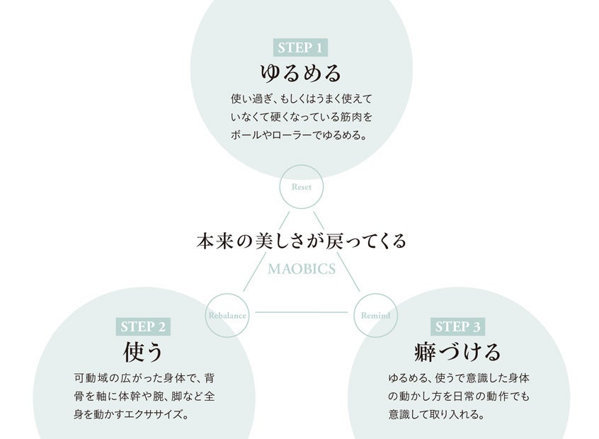 優木まおみ考案の簡単おうちピラティス、それが「マオビクス」。身体が本来の機能を取り戻したとき、健康だけでなく、同時に心身の美しさも手に入っている!