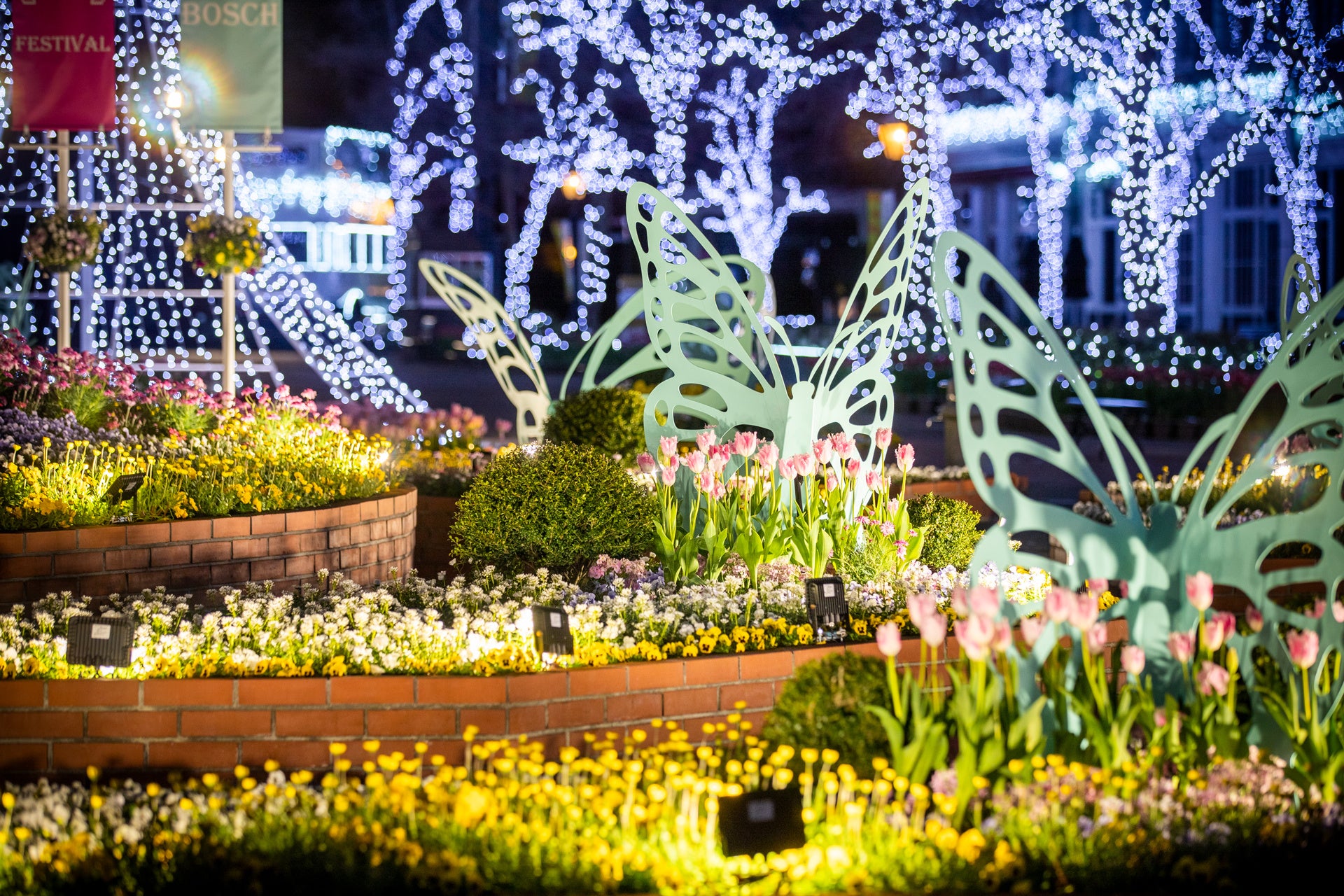 夜になると、花とイルミネーションが織りなす煌びやかな幻想的な世界に