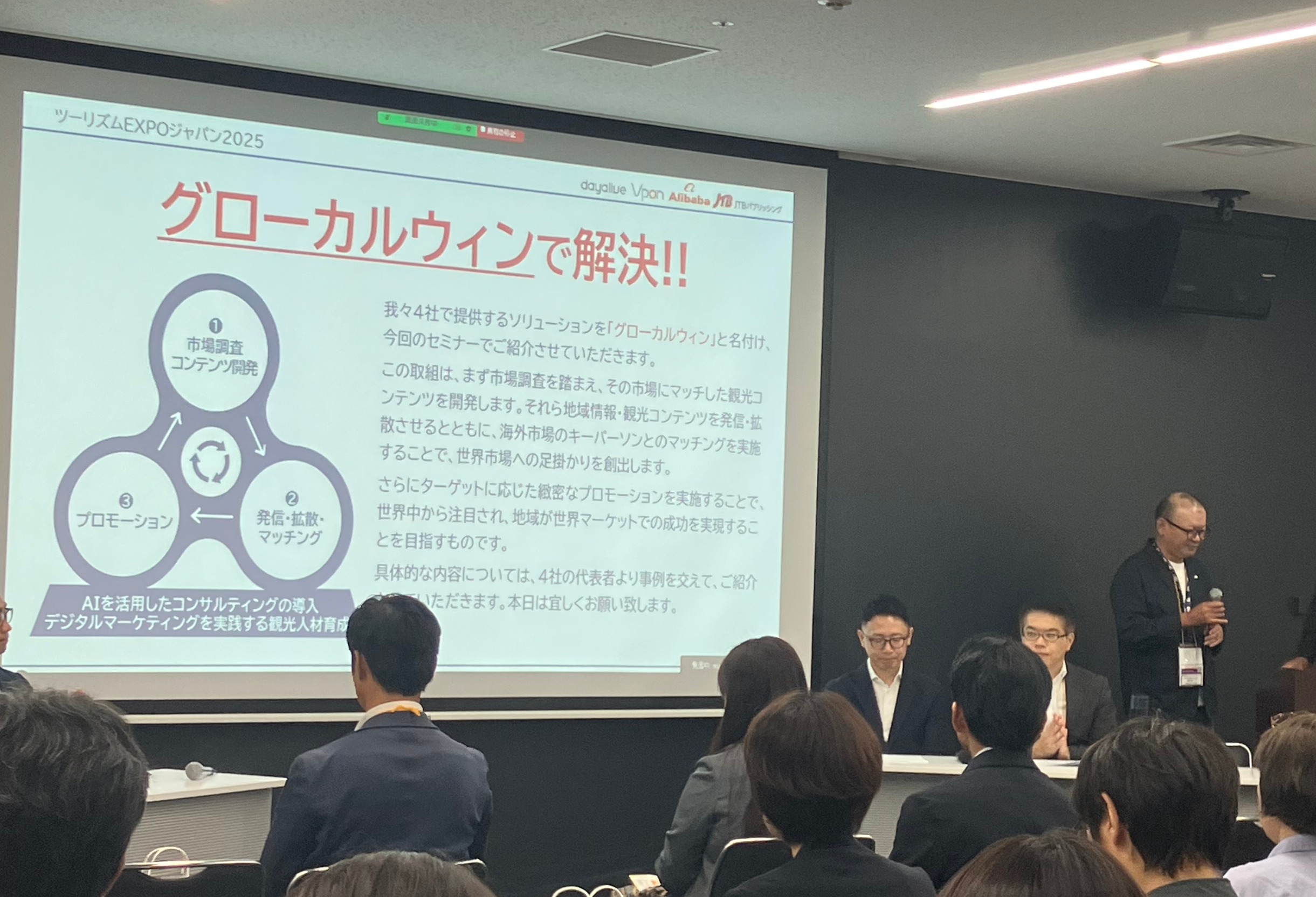 訪日外国人は過去最高水準に回復しつつある一方、集客は首都圏や限られた地域に偏在し、多くの地域が十分に恩恵を受けられていない状況が明らかになっています。そこでJTBパブリッシング、デイアライブ、Vpon JAPAN、アリババジャパンの4社が共同で展開する「グローカルウィン」を提案。市場調査・コンテンツ開発、情報発信プラットフォーム「RURUBU & ALL WAY JAPAN」を中心とした情報発信・拡散、海外バイヤーとのマッチング。さらにプロモーションまでを一貫して支援し、データやAIを活用した実践的なDXソリューションを提供します。事例紹介では、地域特性を生かした観光商品の造成や多言語サイト構築、SNSやインフルエンサーによる情報拡散などの具体的成果を共有。日本が世界から注目を集める今、地域が海外市場へ進出し、持続的な観光振興を実現するための実践的な道筋を示しました。