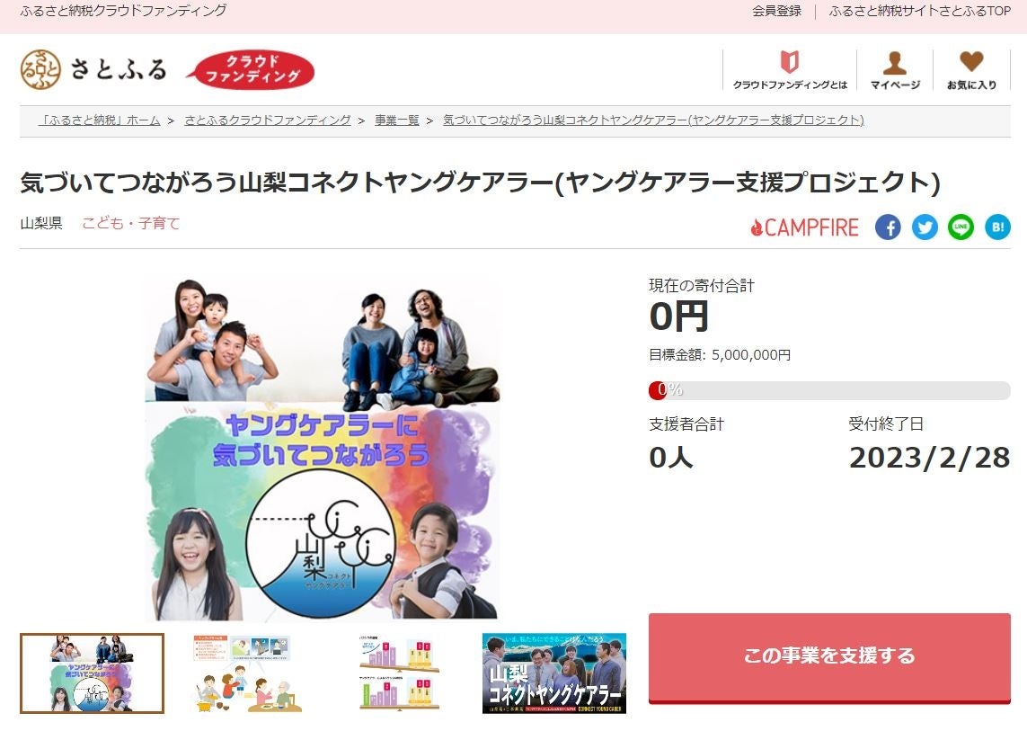 山梨県(知事:長崎 幸太郎)とふるさと納税ポータルサイト「さとふる」(https://www.satofull.jp/)を運営する株式会社さとふる(本社:東京都中央区、代表取締役社長:藤井 宏明)は、寄付金の使途に応じて事業を立ち上げ寄付を募る「さとふるクラウドファンディング」(https://www.satofull.jp/projects/top.php)にて、ヤングケアラーの理解促進や認知向上、支援を行い、子どもが将来への希望や期待を抱き挑戦できる社会を実現するため、2022年11月15日より寄付受け付けを開始します。
