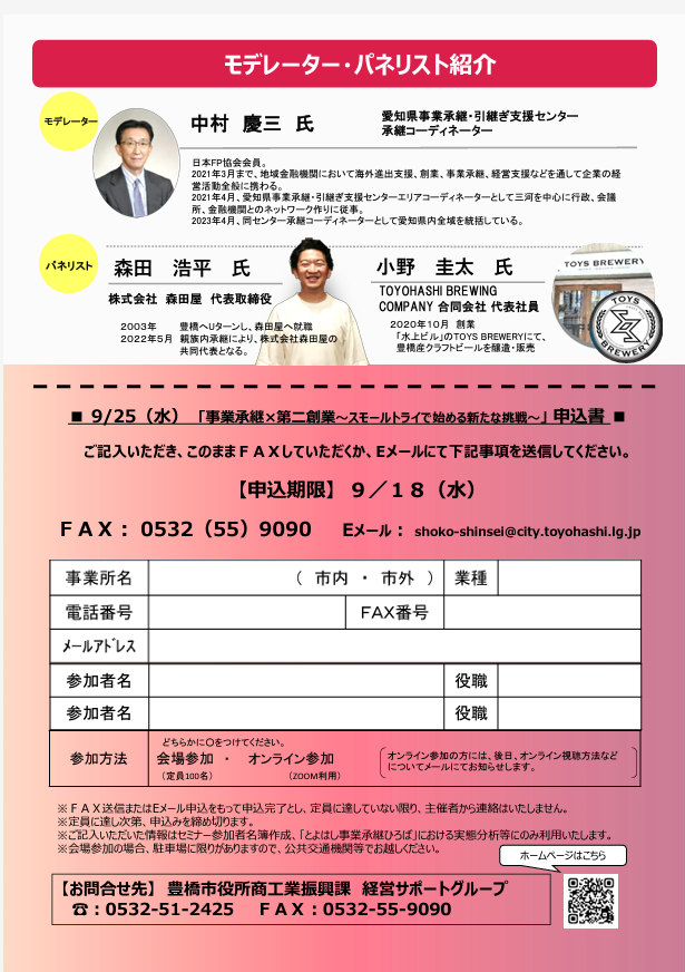 事業承継ひろばについてはコチラ 豊橋市役所 商工業振興課 事業承継ひろばのリンクになります。