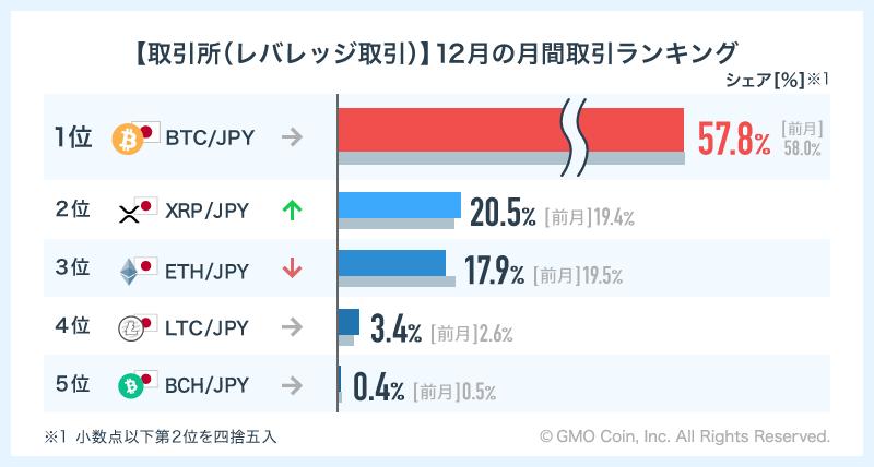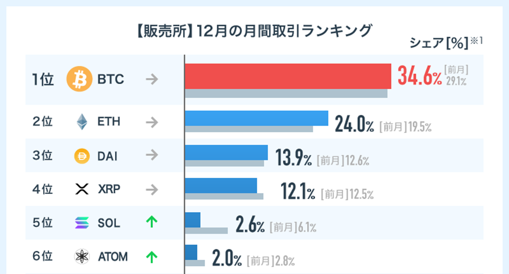 前月11月の取引ランキングと比較すると、ビットコイン(BTC)のシェアが10%近く上がり、その分アルトコインのシェアが下がる結果となりました。