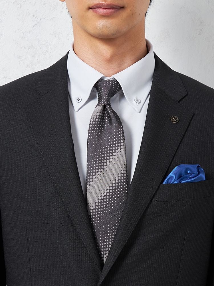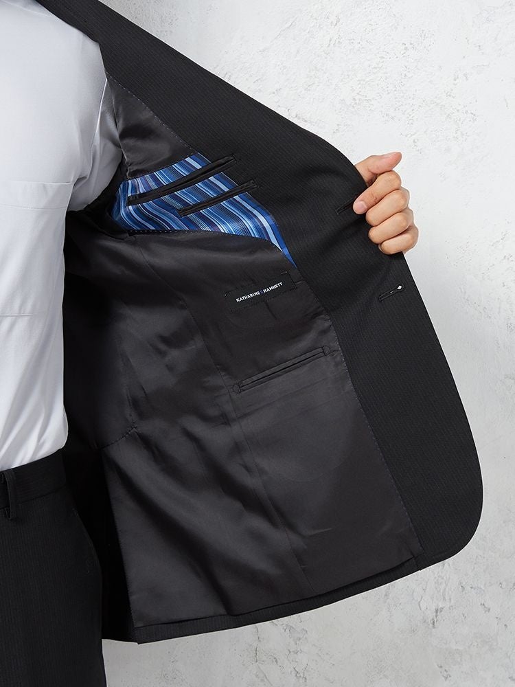 30代のビジネスパーソンのリアルクローズを意識し、かっちりとしたイメージのブリティッシュスタイルをアップデートしトレンドを落とし込むことで、ベーシックなスタイルかつ洗練された印象を演出するビジネススーツをご用意しました。胸ポケット裏地は、ブランドカラーのロイヤルブルーを採用しポケットチーフになる仕様にし、ラペルピンは英国国花のローズをモチーフに、さらに裏地箇所はKATHARINE HAMNETTのアーカイヴから採用したネクタイと同柄のマルチストライプパターンを使用し、細部までデザインにこだわりました。