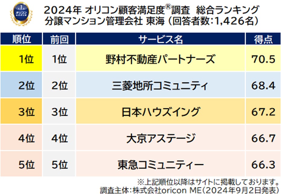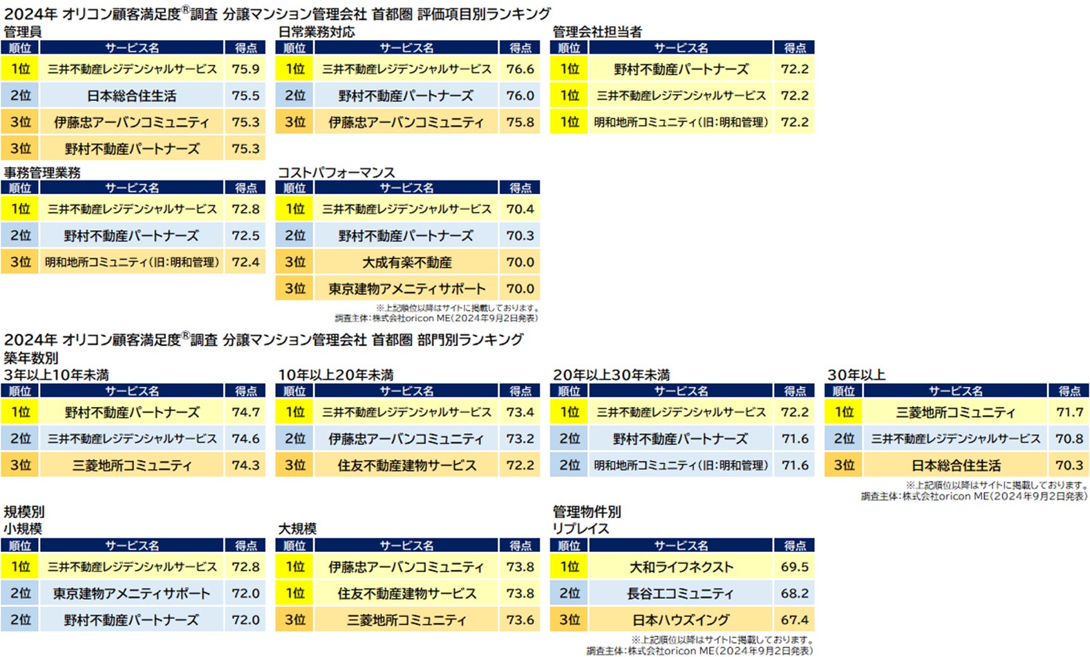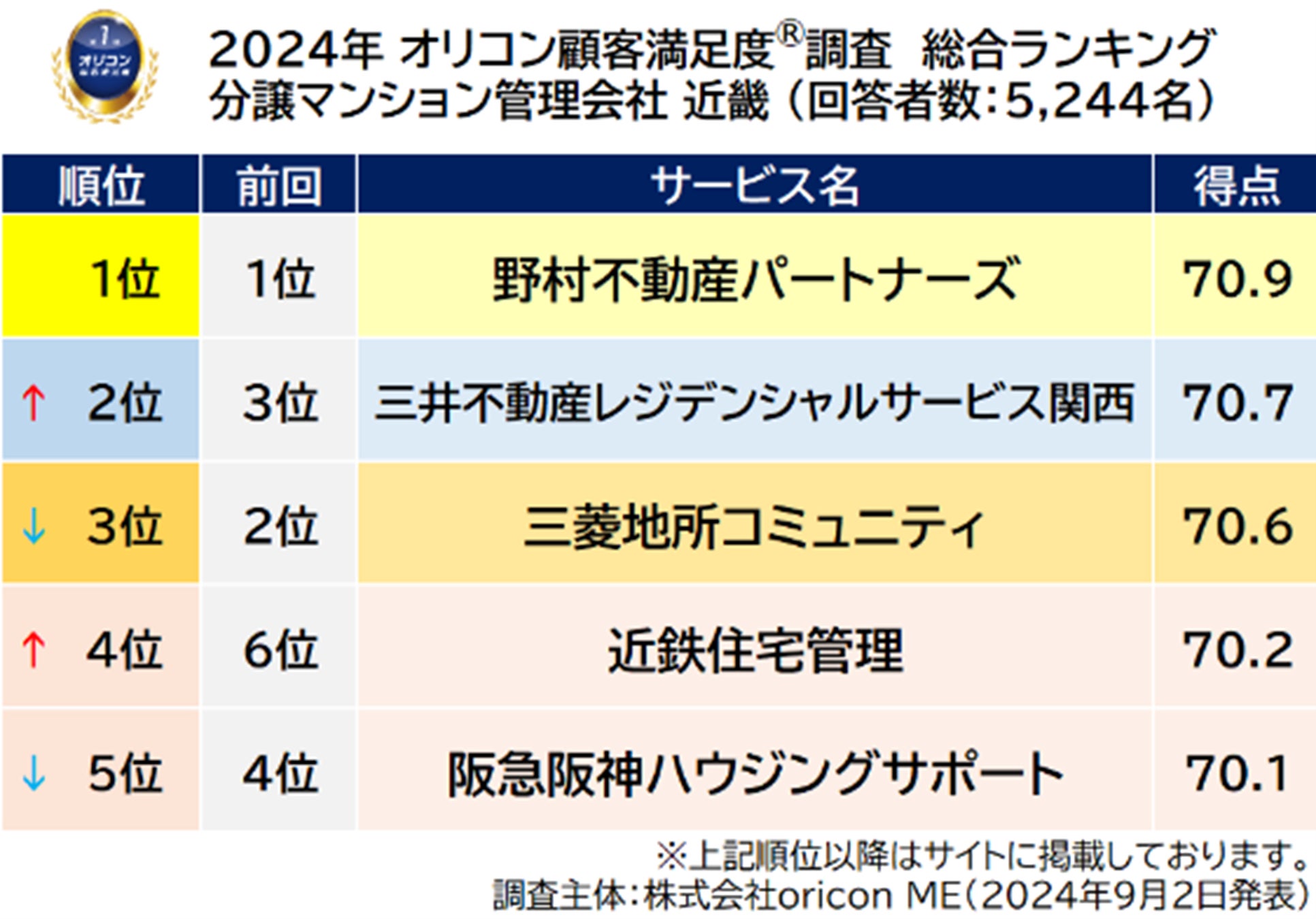 実際のサービス利用者を対象に第三者の立場で顧客満足度調査を実施する株式会社oricon ME(本社:東京都港区 代表取締役社長:小池 恒 略称:オリコン) は、『分譲マンション管理会社』についての満足度調査を実施し、2024年9月2日(月)14時にその結果を「オリコン顧客満足度®」公式サイト内( https://life.oricon.co.jp/ )にて発表いたしました。ランキングの結果は、下記の通りとなりました。