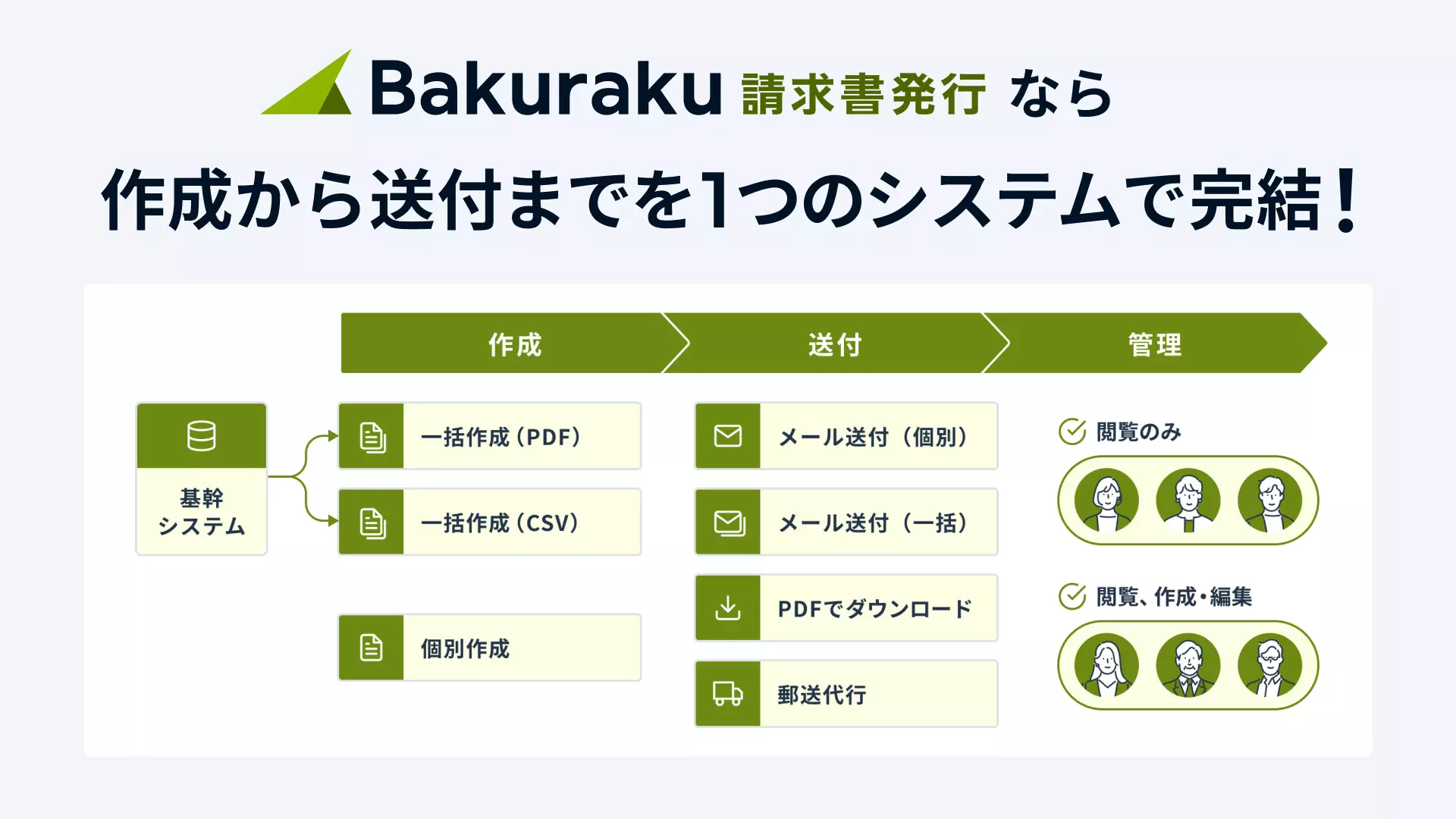バクラク請求書発行は、請求書をはじめとしたあらゆる帳票の作成・送付・保存が可能な帳票発行システムです。インボイス制度や電子帳簿保存法に完全対応しており、業務効率化やペーパーレス化と法対応を同時に実現できます。