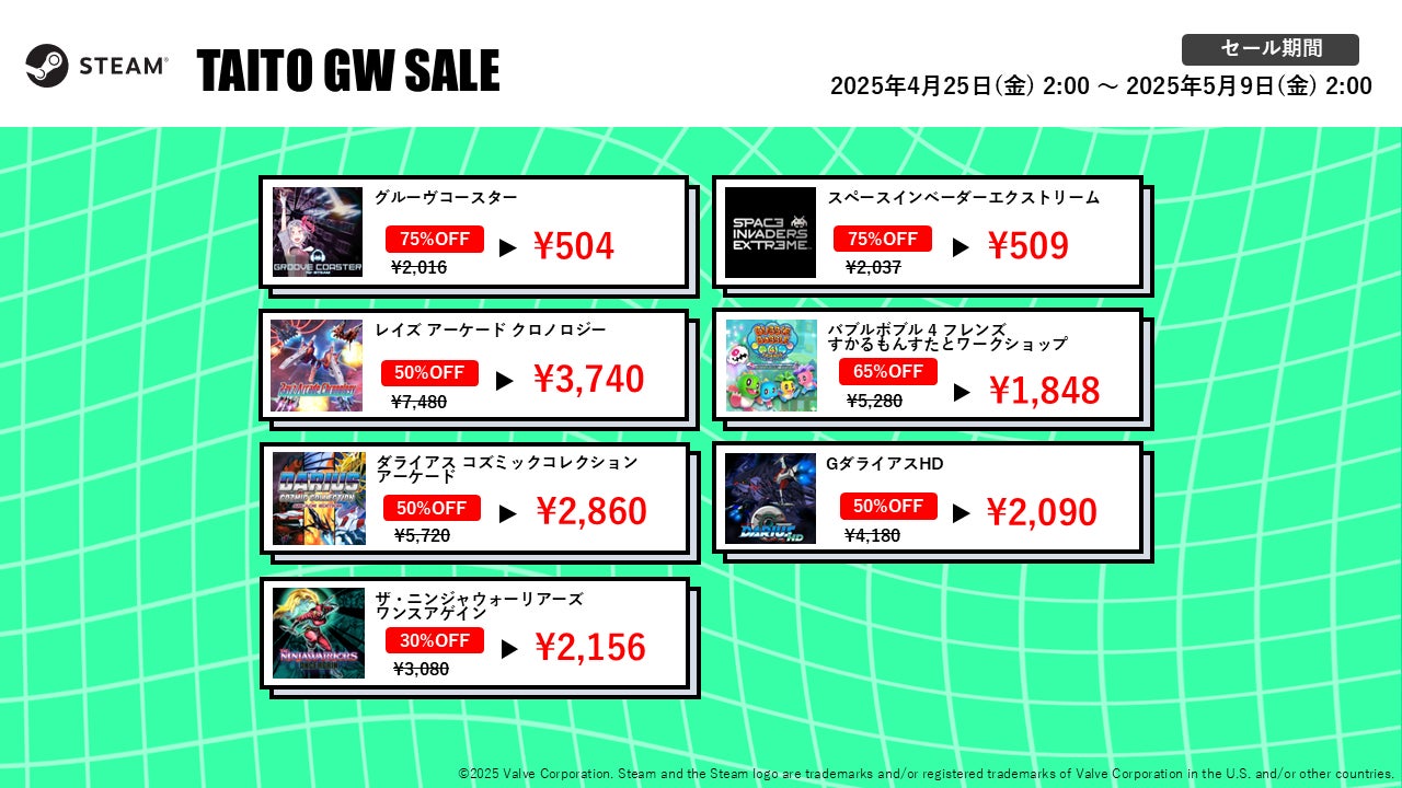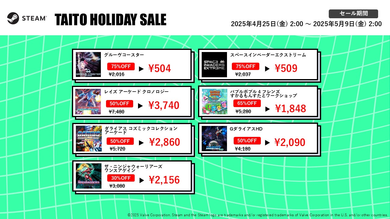 Steam版『スペースインベーダーエクストリーム』『グルーヴコースター』が75%OFF、『タイトーマイルストーン3』が初の20%OFFとなる他、『ダライアス』シリーズや、『レイズ アーケード クロノロジー』などが対象となります。