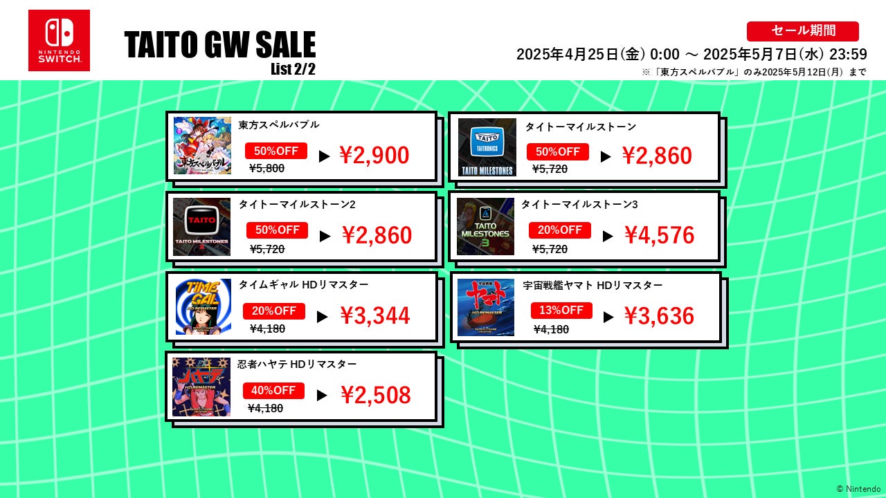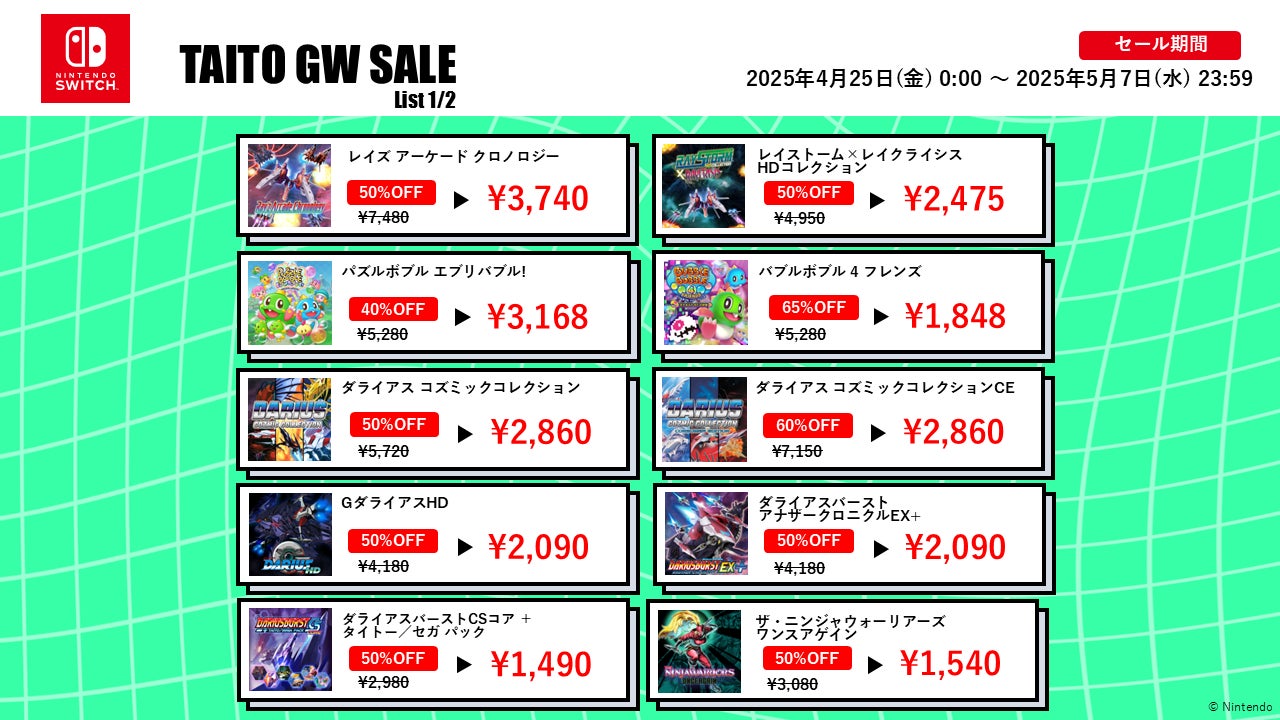 株式会社タイトー(本社:東京都新宿区、以下タイトー)は、対象のNintendo Switch™用ソフト(ダウンロード版)やPlayStation®4用ソフト(ダウンロード版)、Steam用ソフトが最大75%オフとなる「タイトーGWセール2025」を実施いたします。